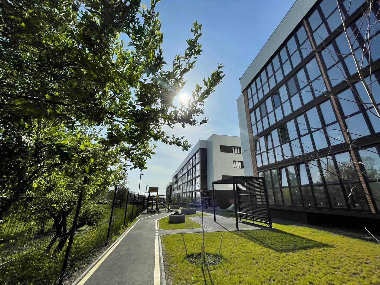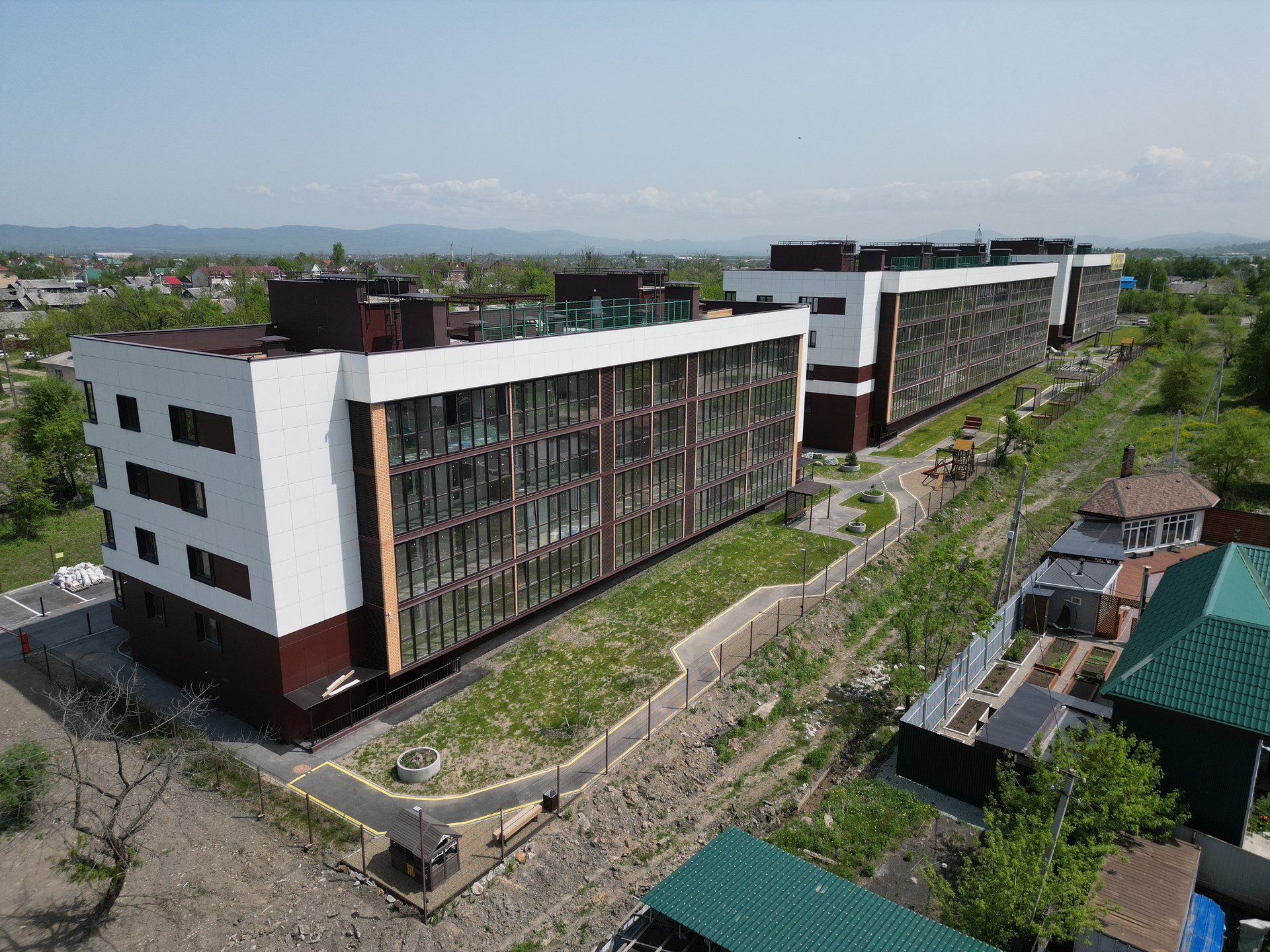 Комплекс состоит из трех стильных и красивых корпусов, каждый из которых имеет всего 4 этажа с эксплуатируемой кровлей.