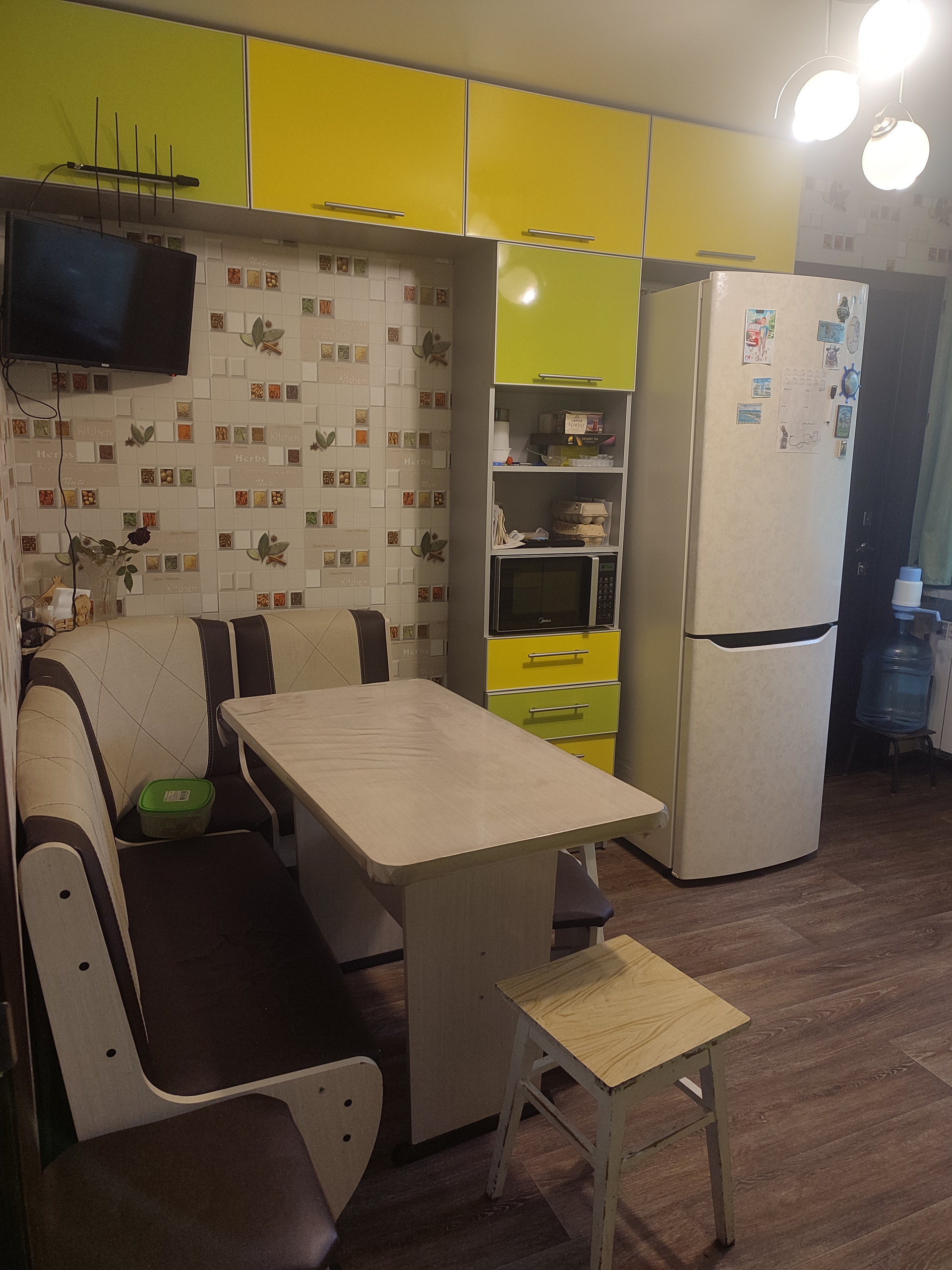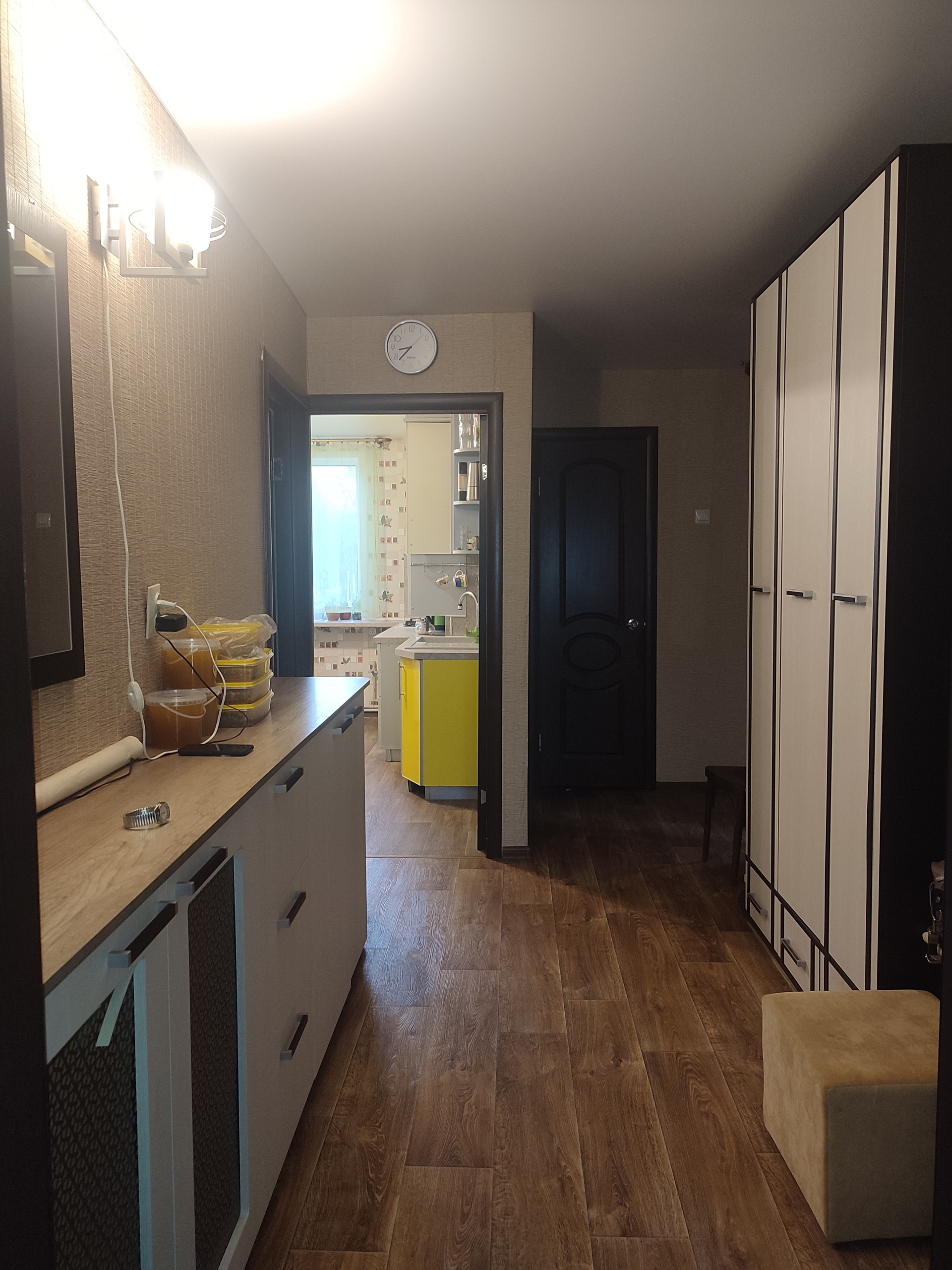 Потолки натяжные в одной комнате, на кухне и в прихожей.
