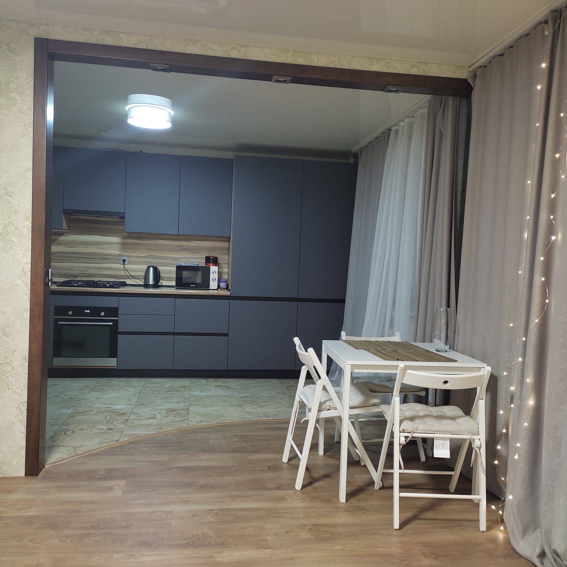 - Остаётся новый кухонный гарнитур, встроенная варочная панель и духовой шкаф