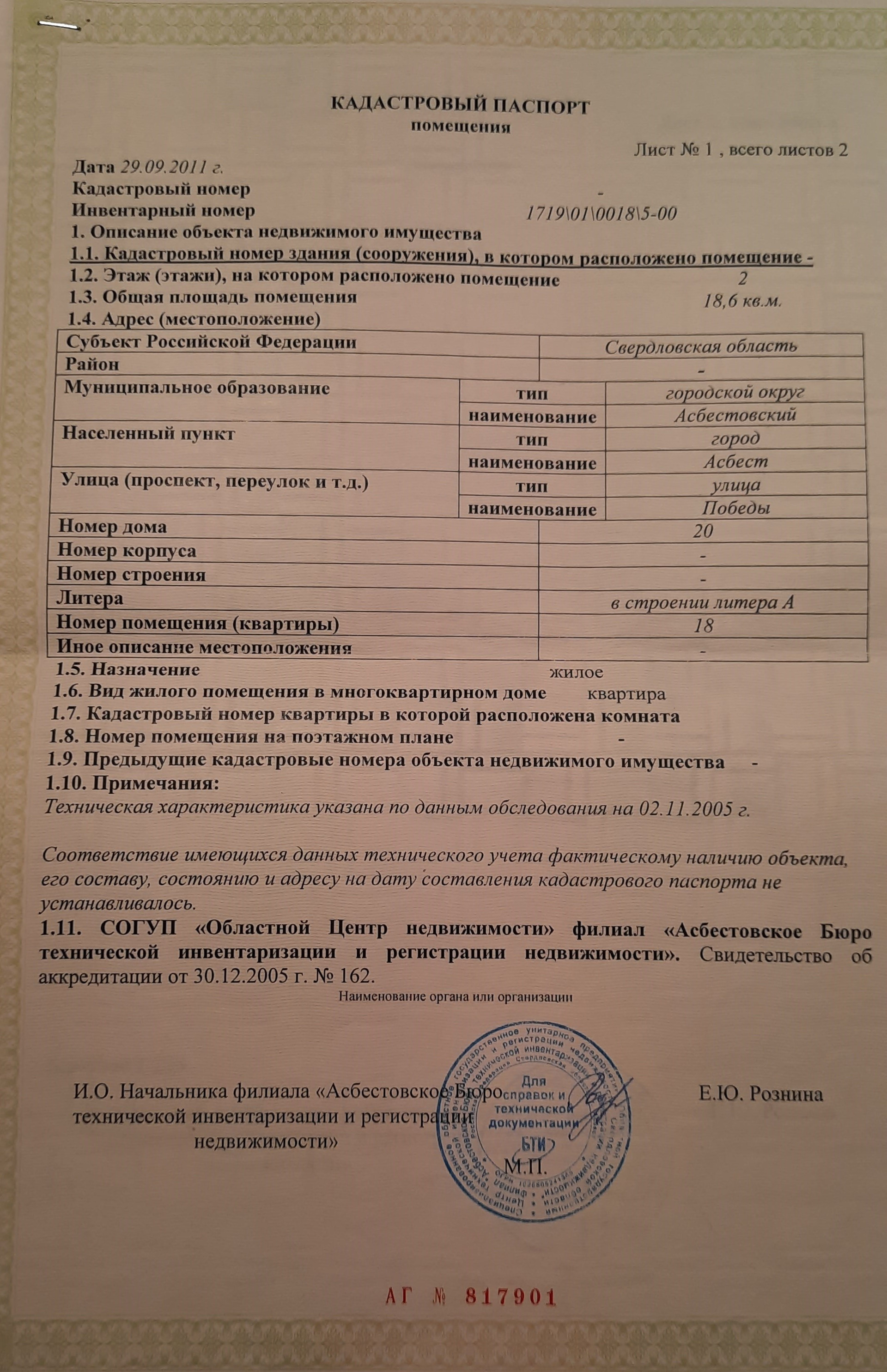 1-комнатная квартира, 18.6 м2, этаж 2 / 5, на продажу в Асбесте, улица Победы, 20