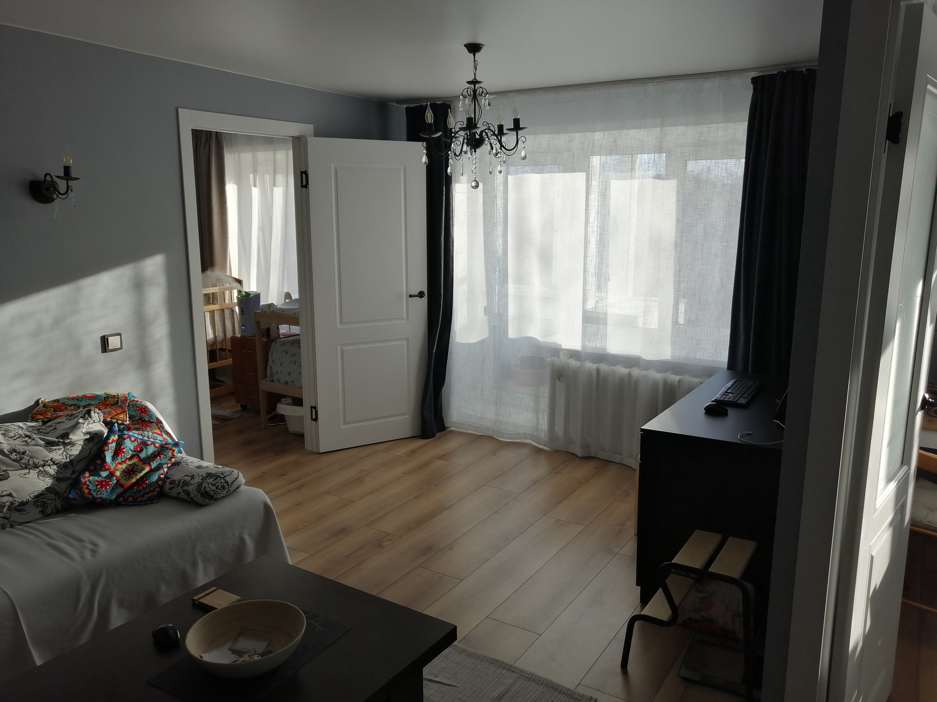 В 2021 проведен капитальный ремонт квартиры с заменой электропроводки, труб, канализации, застекление балкона, ламинат единым контуром, стены выведены под покраску, установлена надежная входная сейф-дверь, качественные межкомнатные двери, натяжной потолок, кладовка переделана под гардероб.