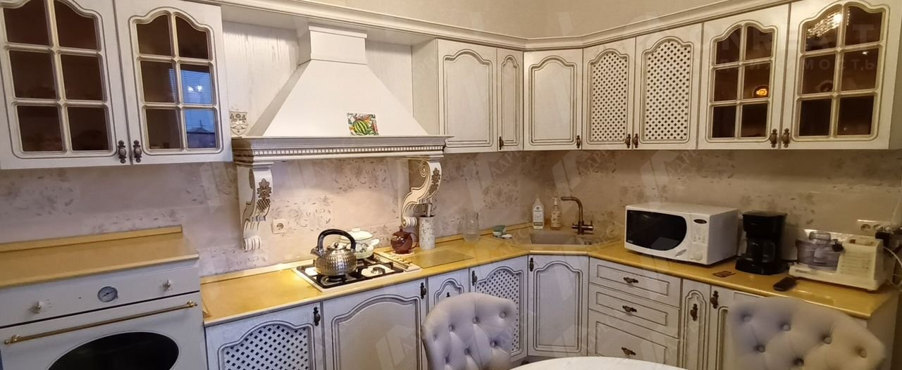 — Оборудованная кухня с современными бытовыми приборами и местом для обеденной зоны.