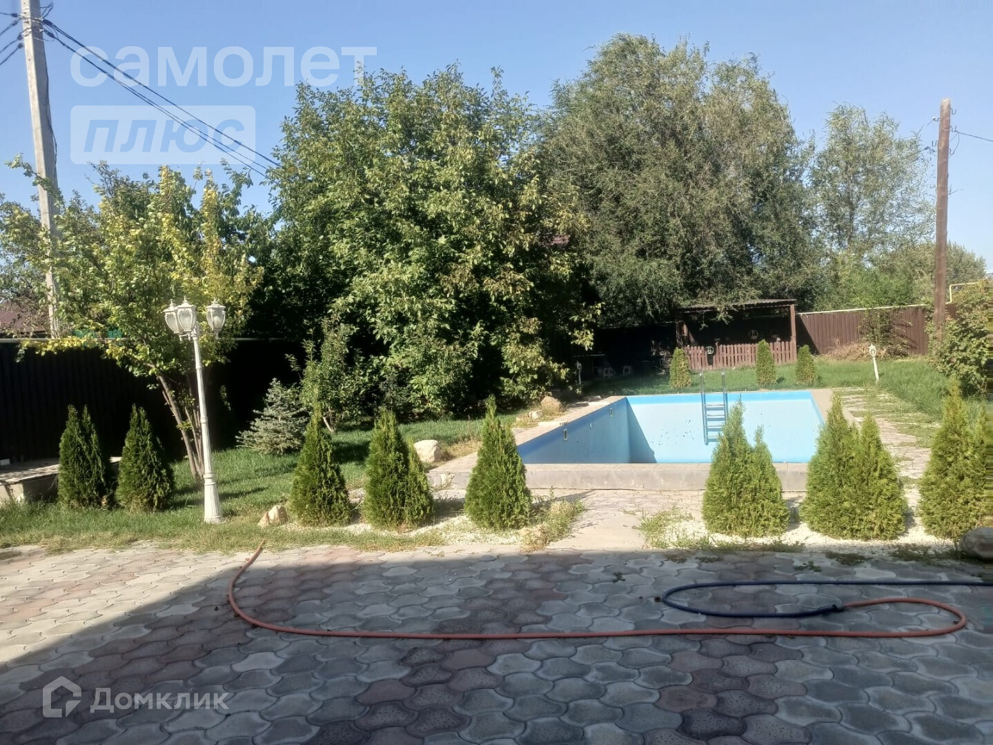 - В большом ухоженном дворе есть бассейн, гостевой дом с панорамными окнами, беседка и зона барбекю.