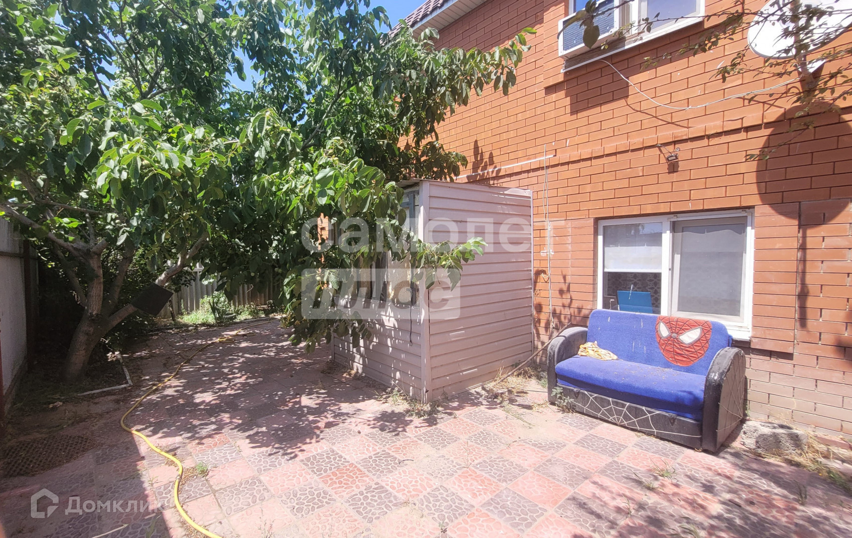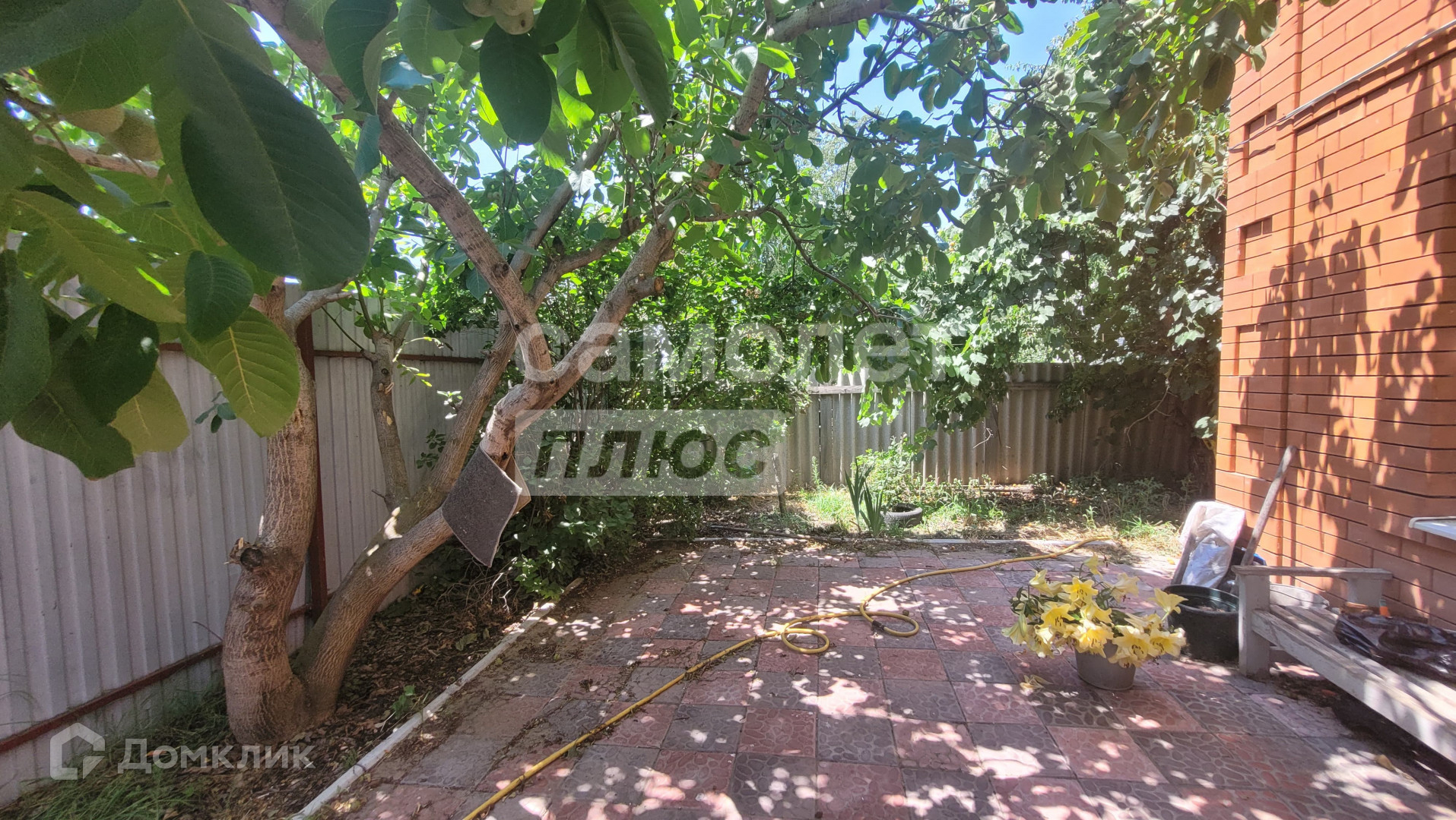 Территория перед домом выложена тратуарной плиткой. На участке посажаны плодовые деревья, земля пригодна для посадки растений.