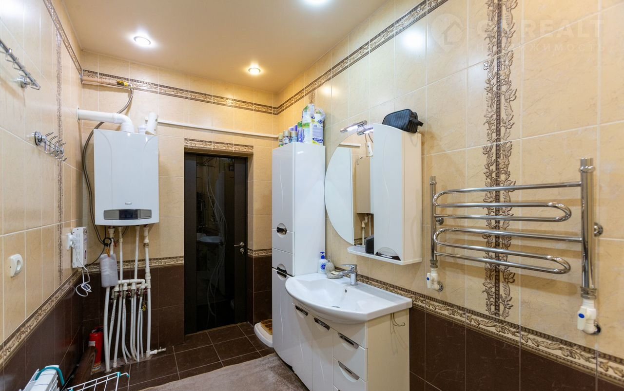Планировка представляет собой входную зону, просторный холл, кухня, совмещенный санузел с ванной, зал-гостиная и 3 изолированные спальные (родительская, детская и гостевая), выход в утепленный гараж на 2 автомобиля, откуда имеется выход во вторую часть дома (достроенную позднее–под зону отдыха, душевую, баню), которую новые собственники обустроят под свой вкус. В доме установлено индивидуальное отопление с системой «теплый пол» – 2 двухконтурных котла ВАХI (один на основную часть жилую дома, второй – на пристроенную часть). Напольное покрытие – ламинат и плитка, стеклопакеты пластиковые, установлены сплитсистемы. Коммуникации центральные, канализация автономная с металлической емкостью на 5 кубов. Имеется система аварийного освещения, насос на водоснабжение и гидрофор дополнительного водоснабжения с накопителем, а также система видеонаблюдения. Во дворе имеются хозпостройки, летний душ и туалет, навес с местом для парковки машины. Растут фруктовые деревья (айва, груша, абрикос, черешня, вишня), орех, хвойные кустарники.