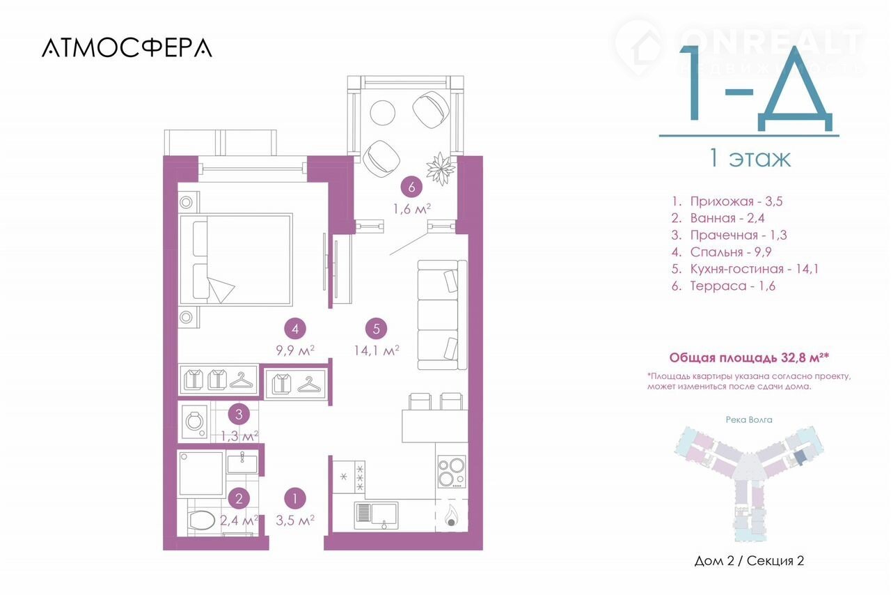 Общая площадь 32.8 м2