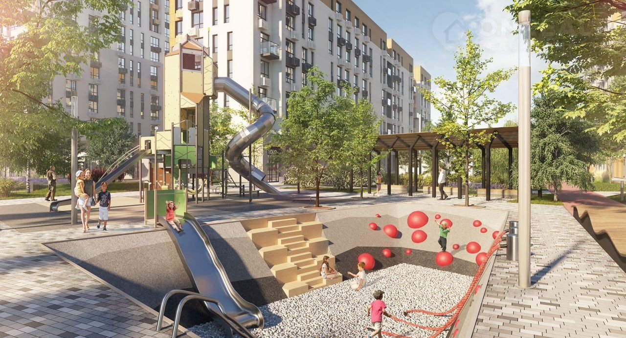 Общая площадь благоустройства проекта — 7 гектаров. Главная особенность проекта — переменная этажность домов от 8 до 25 этажей.
