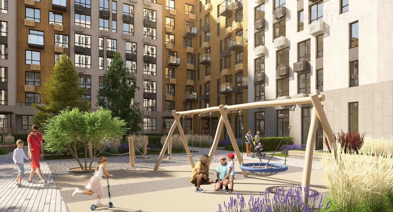 Первый уровень — свой двор-парк. Это благоустроенная придомовая территория с дендропарком, в котором деревья и кустарники высажены с учетом всех четырех сезонов.