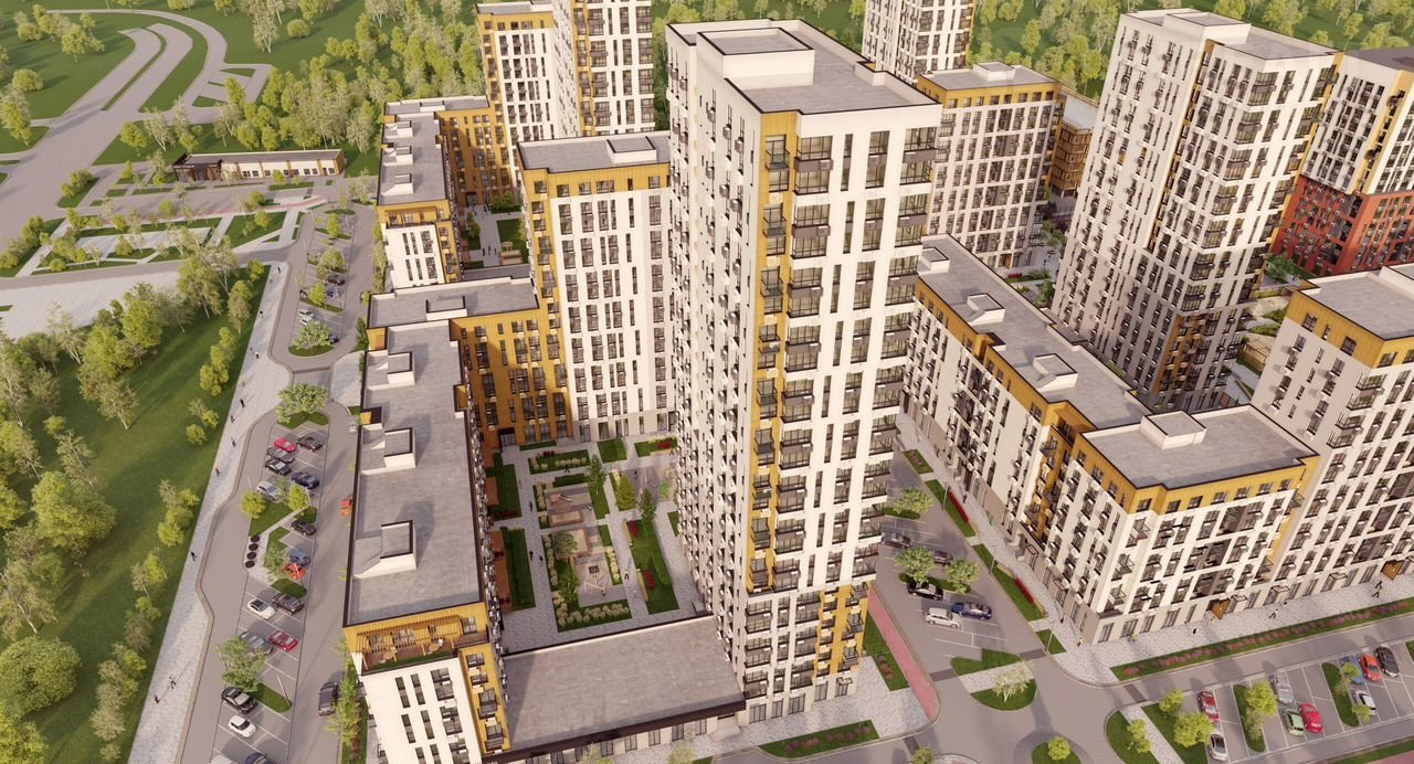 Общая площадь благоустройства проекта — 7 гектаров. Главная особенность проекта — переменная этажность домов от 8 до 25 этажей.