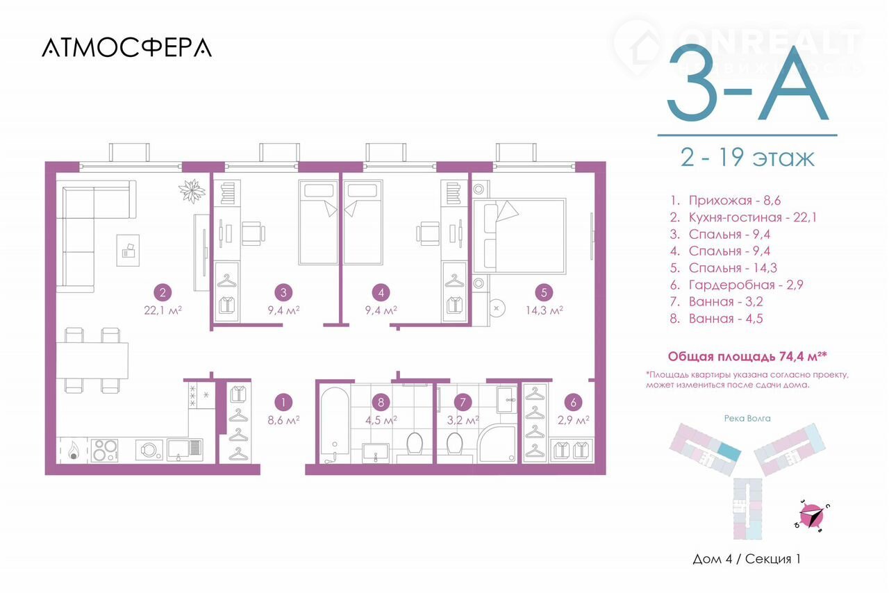 3-комнатная квартира, 73.9 м2, этаж 16 / 23, на продажу в Астрахани, улица Бехтерева, 12/4