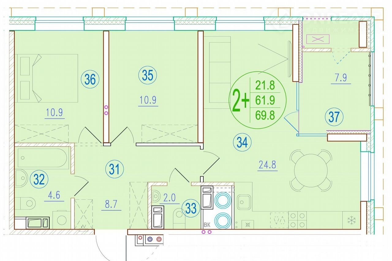 Общая площадь 69.8 м2