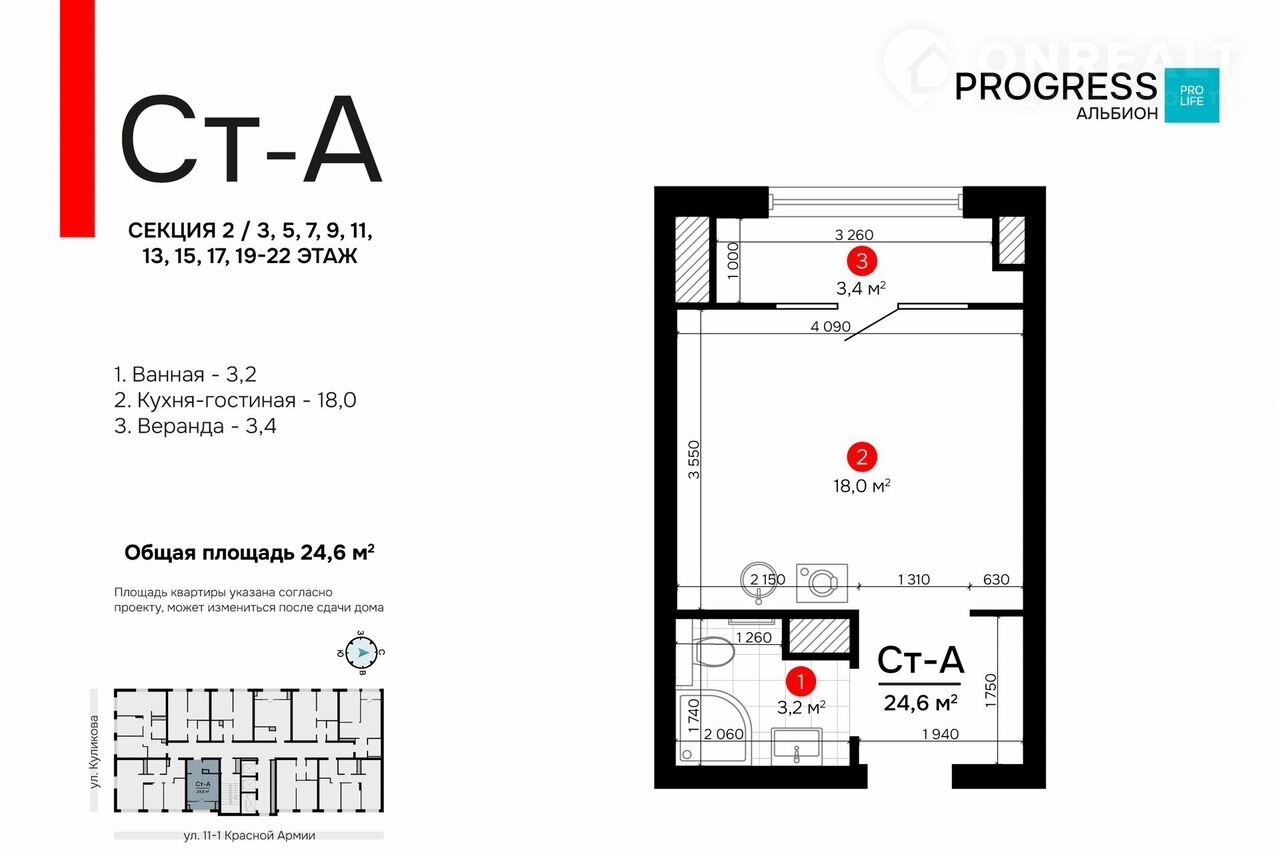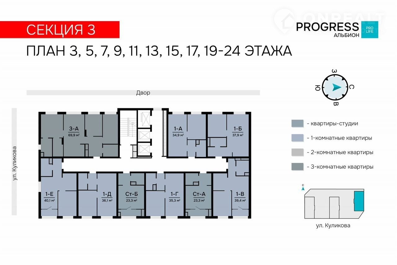 «РRОGRЕSS Альбион» находится на улице Куликова в развивающемся Кировском районе. Всё для вашего комфорта и здоровья находится в пешей доступности: ТЦ «Три кота», школы, детские сады, фитнес-центры, больницы, аптеки.