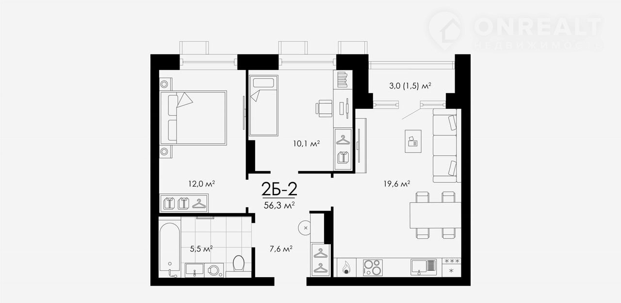Общая площадь 56.3 м2