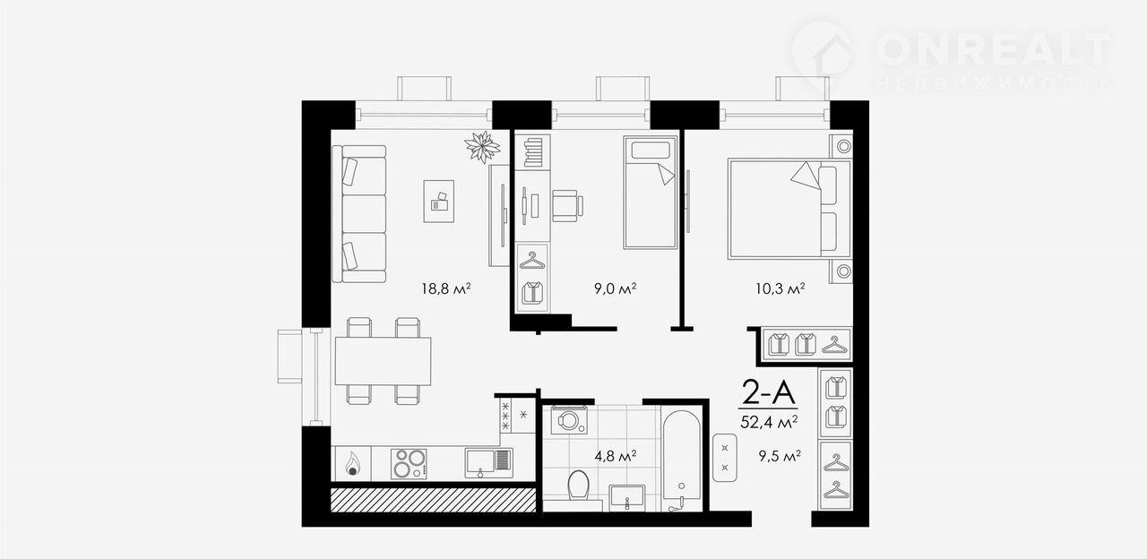 Общая площадь 52.4 м2