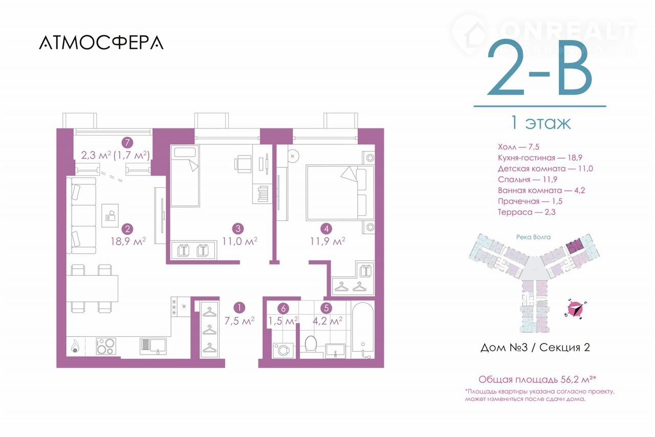 Общая площадь 56.1 м2