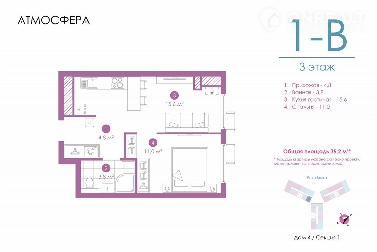 1-комнатная квартира, 34.4 м2, этаж 3 / 23, на продажу в Астрахани, улица Бехтерева, 12/4