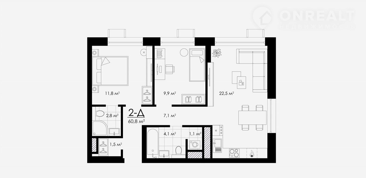 Общая площадь 60.8 м2