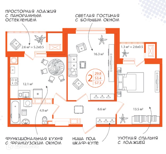 кухня-гостиная 12,1м2, две спальни 13, 5м2 16, 3м2