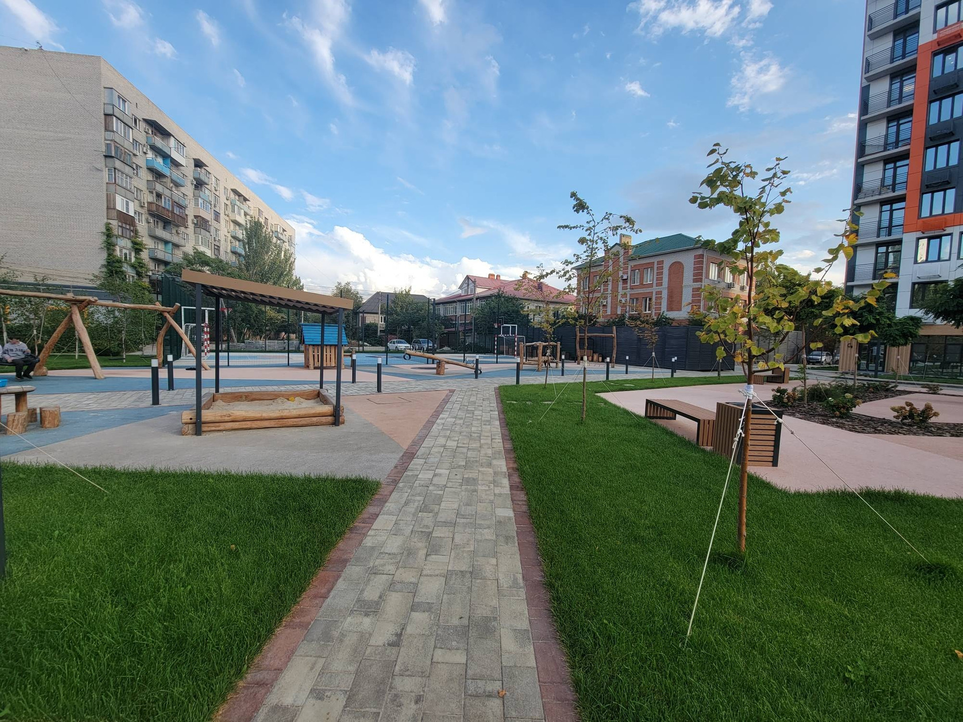 Во дворе детские игровые площадки для разных возрастов, спортивные площадки, уличные тренажёры, скалодром, беседки-перголы, workout зона.