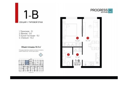 Продается 1-комнатная квартира 21/23 кирпичного дома, 31, 97 кв.м, в строящемся доме ЖК Progress Восточный по ул. 3-я Зеленгинская,1.