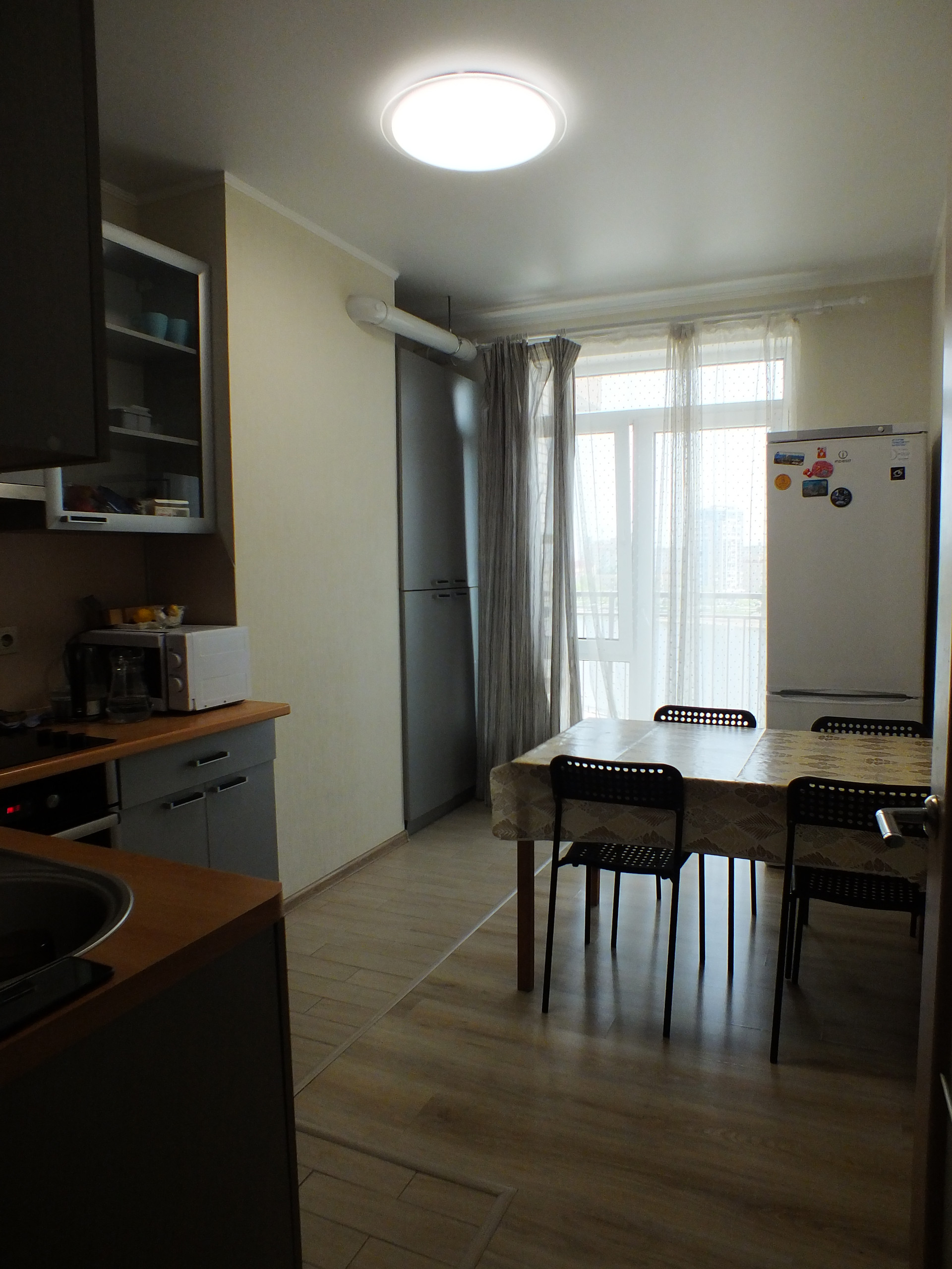 Чистовая отделка от застройщика, установлены окна ПВХ в алюминиевом профиле Rehau, входная дверь Torex, стены оштукатурены, обои под покраску, натяжной потолок, на полу ламинат и плитка.