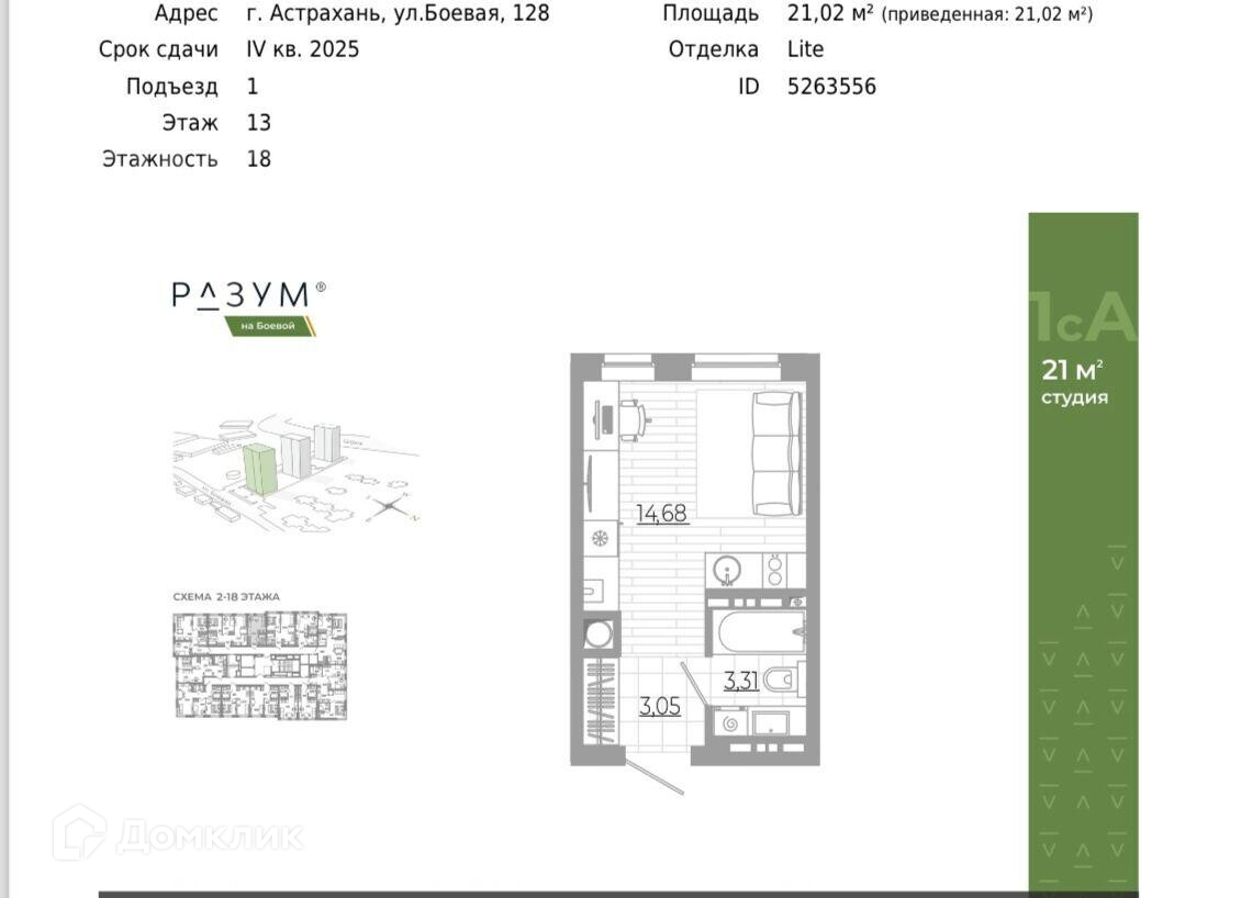 Квартира студия, 21 м2, этаж 13 / 18, на продажу в Астрахани, Боевая улица, 132с2