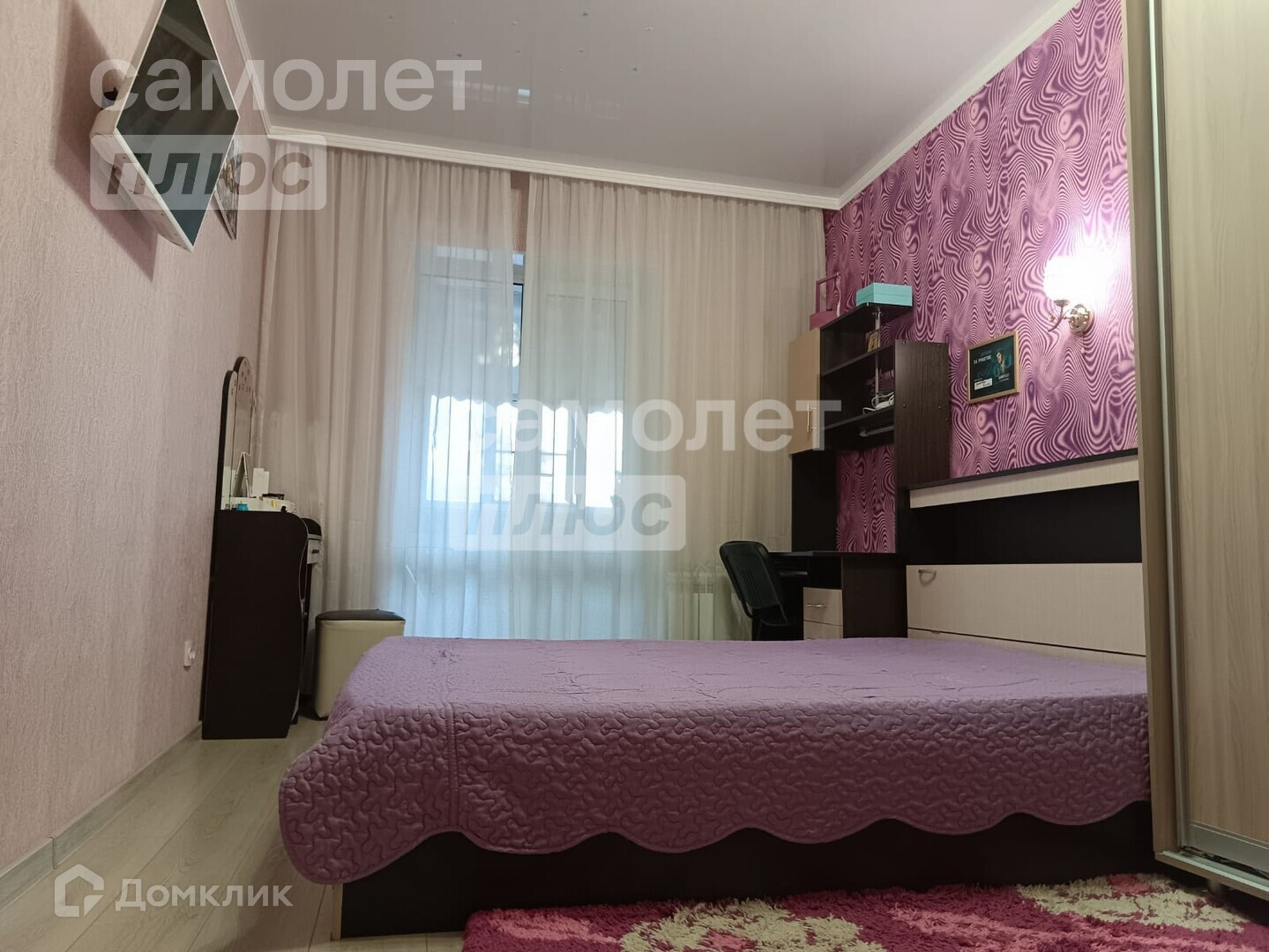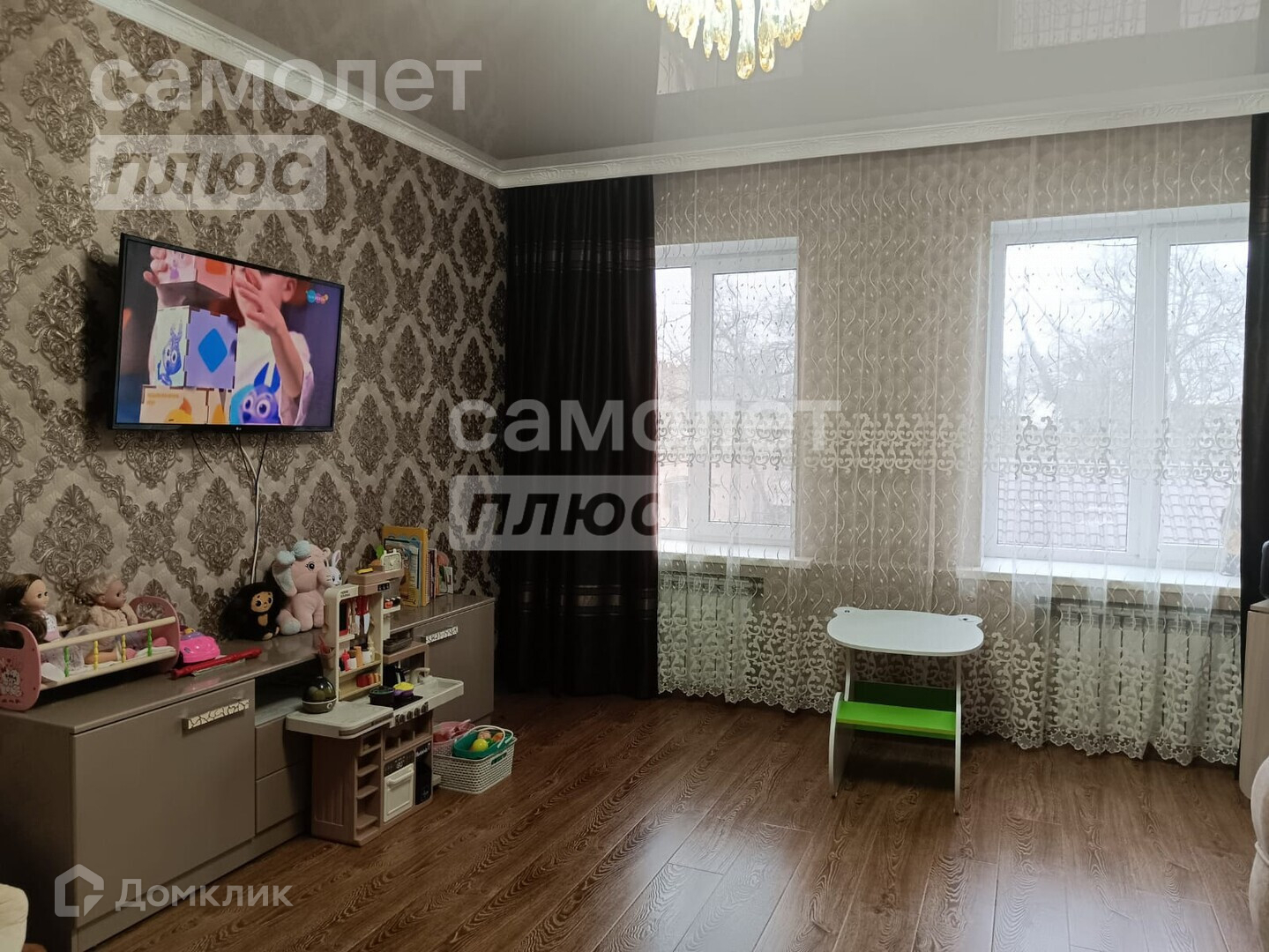 — поклеены современные обои, на полу ламинат,