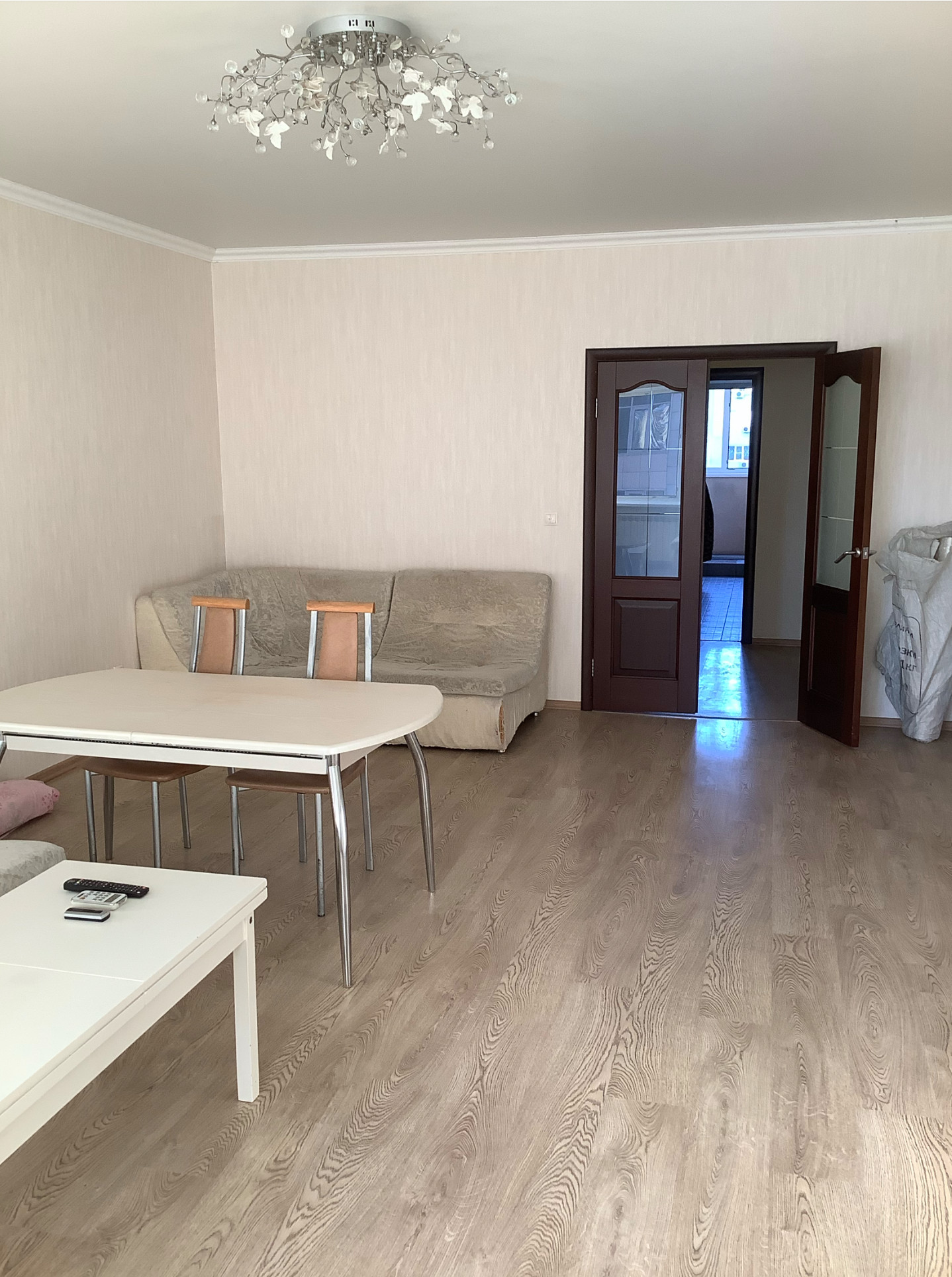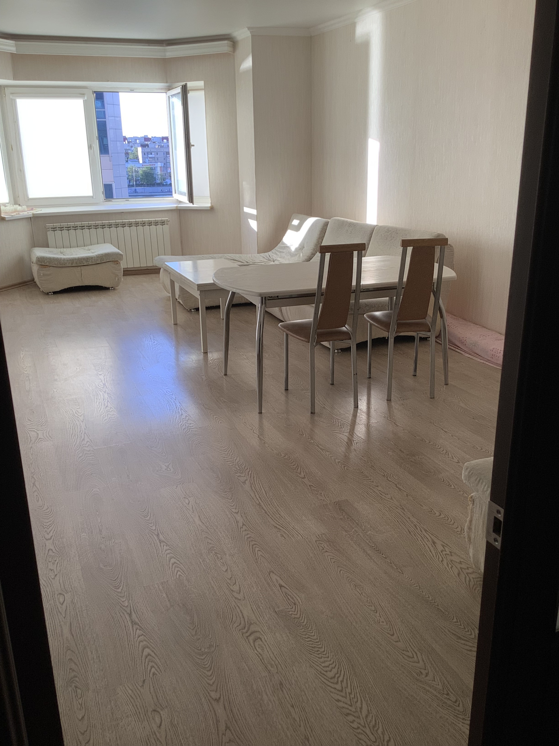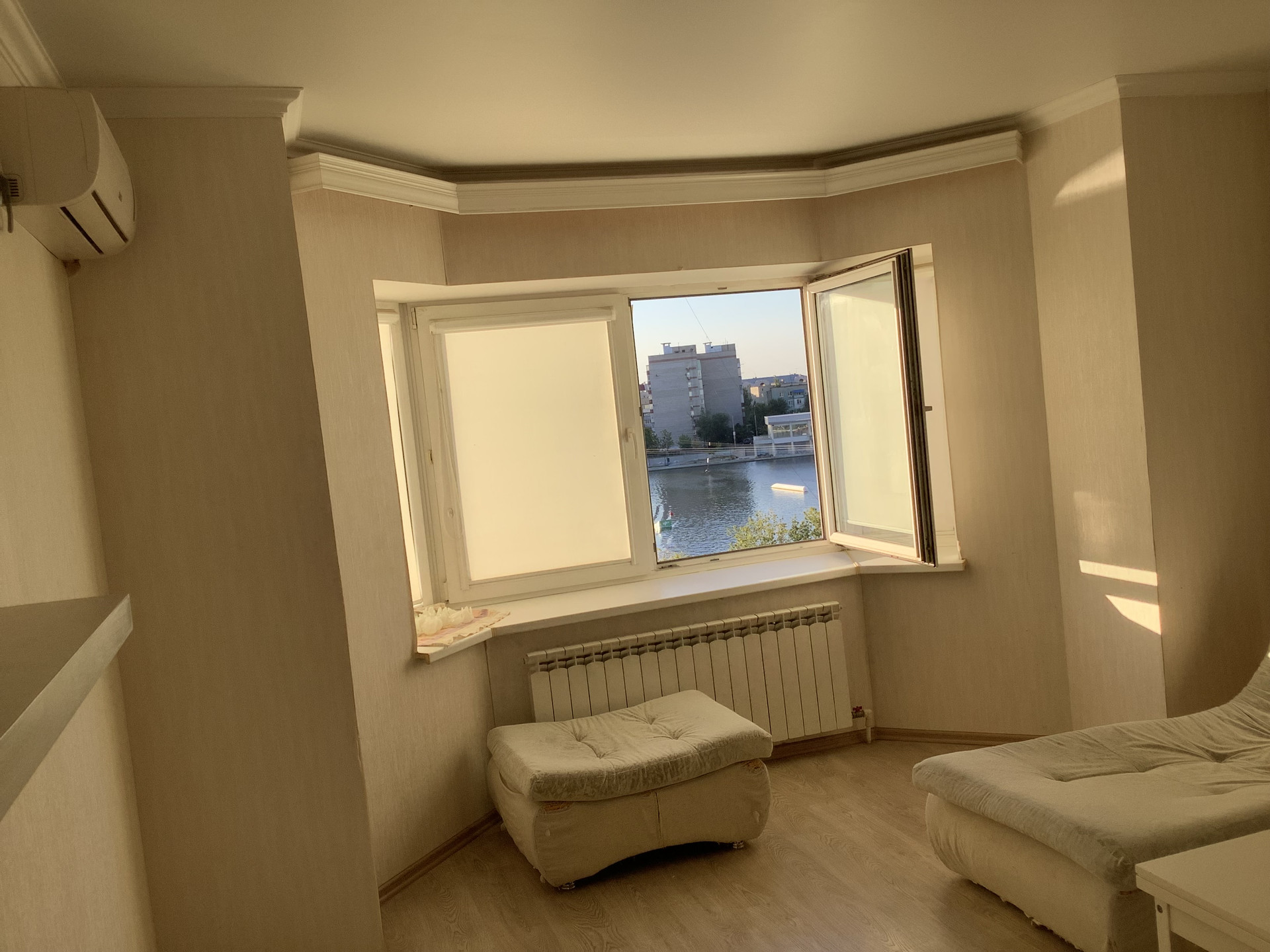 ✅ Расположение комнат - как крылья стрекозы: прихожая, потом слева кухня(гостинная), напротив зал с эркером с видом на канал набережной, далее по прихожей идём и упираемся во второй санузел, слева одна комната(спальная, детская, условно мебельной этажеркой разделена на две части), а справа другая спальная - для взрослых с кроватью и матрацем 2х2, в спальной комнате открытая лоджия; мебель вся, люстры остаются в квартире. На полу плитка и ламинат.