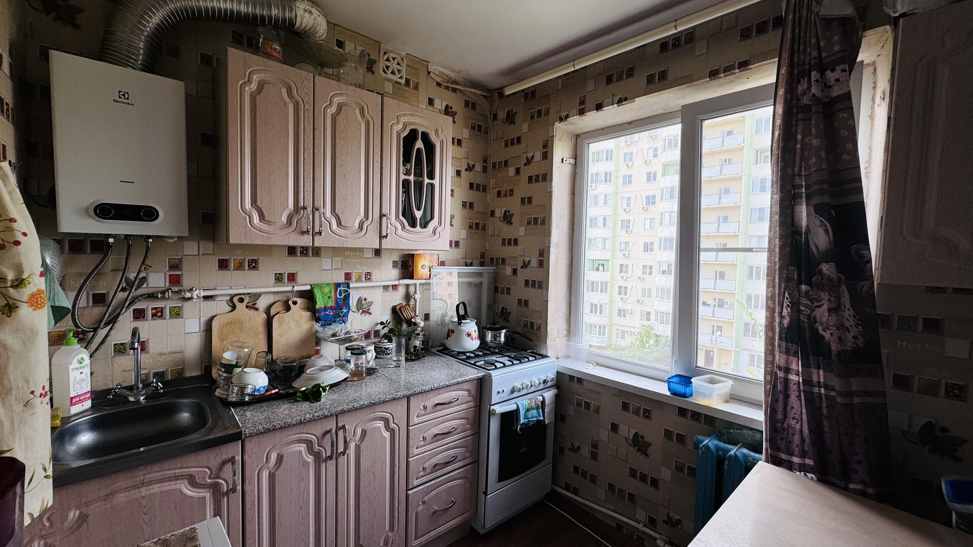 Квартира находится на последнем, пятом этаже панельного дома, построенного в 1969 году. С этой высоты открывается вид на спокойный двор, где расположена детская площадка – идеальное место для семей с детьми.