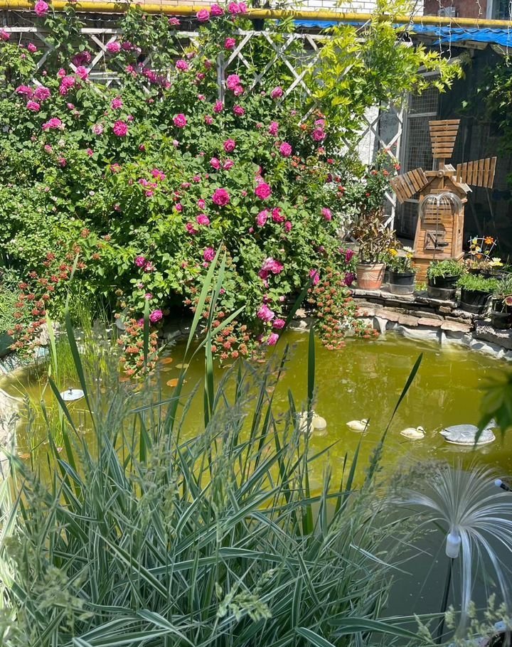 На период аренды Вы попадаете в оазис в черте города, не надо никакой турбазы. В вашем распоряжении придомовая территория с прудом, с беседками, с бассейнами для взрослых и маленьких , зона барбекю с несколькими мангалами в окружении деревьев, кустарников , постоянно цветущих роз , хризантем и других цветов.