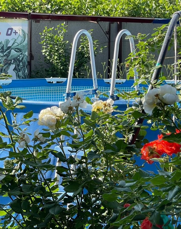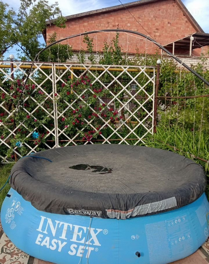 С наступлением жары действует бассейн (каркасный) 5.5 метров в диаметре на 1.32 м глубина, Ориентировочно 22куб .м. И для самых маленьких не глубокий до 1 куб.м. По периметру дома ведется видеонаблюдение.
