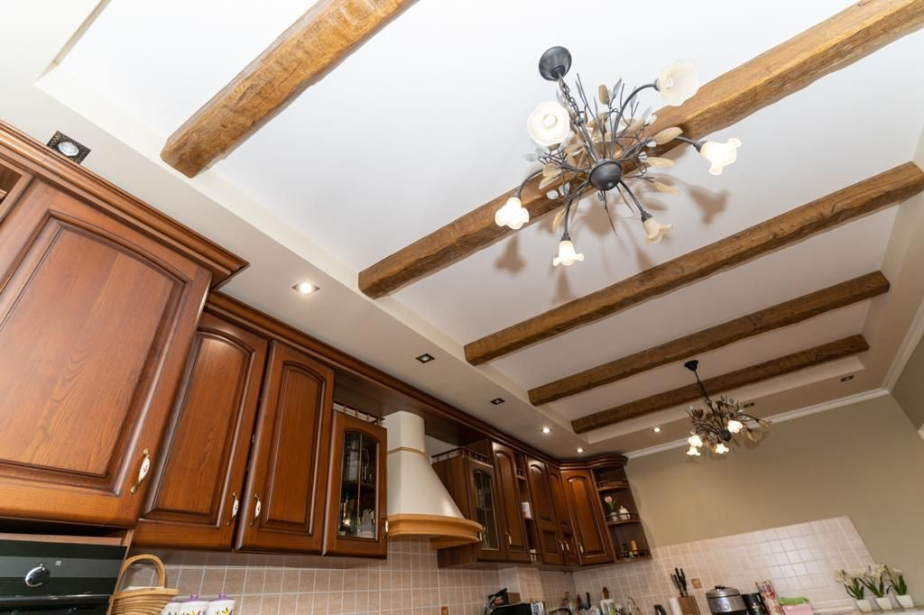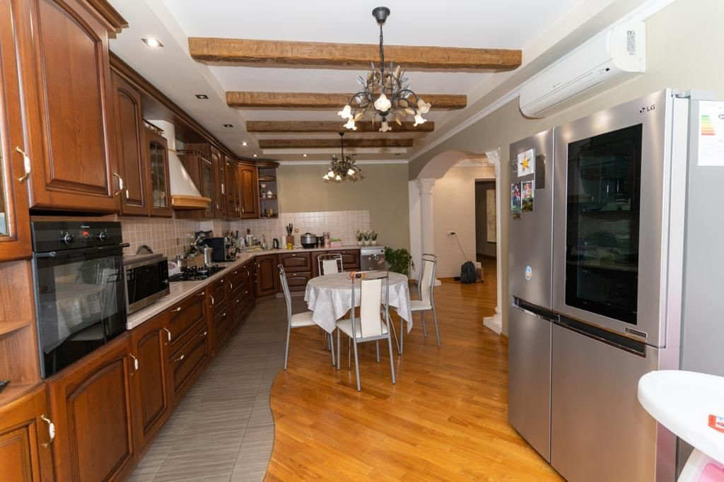 Просторная кухня оснащена кухонной гарнитуром со всей бытовой техникой, включая посудомоечную машину.