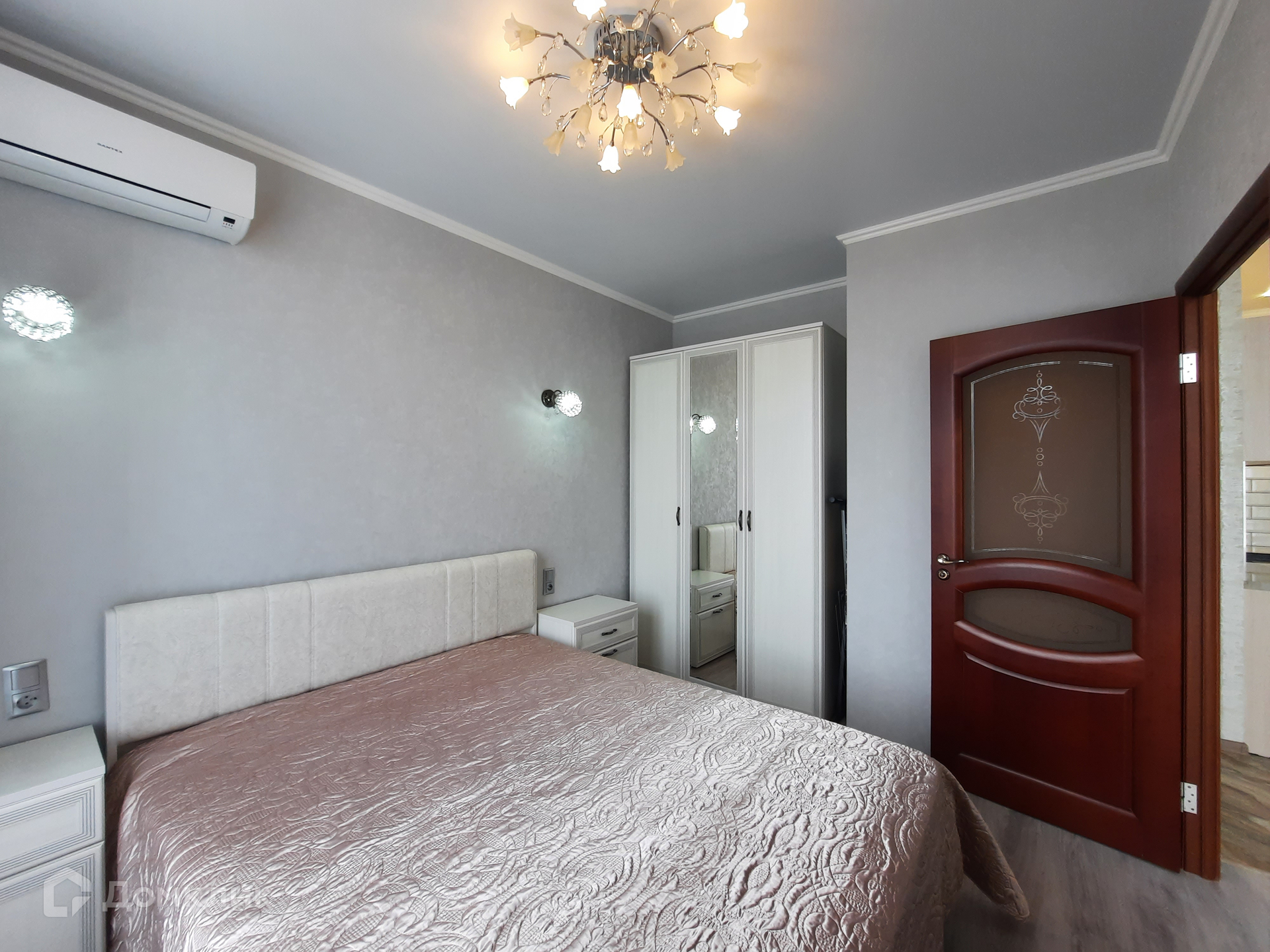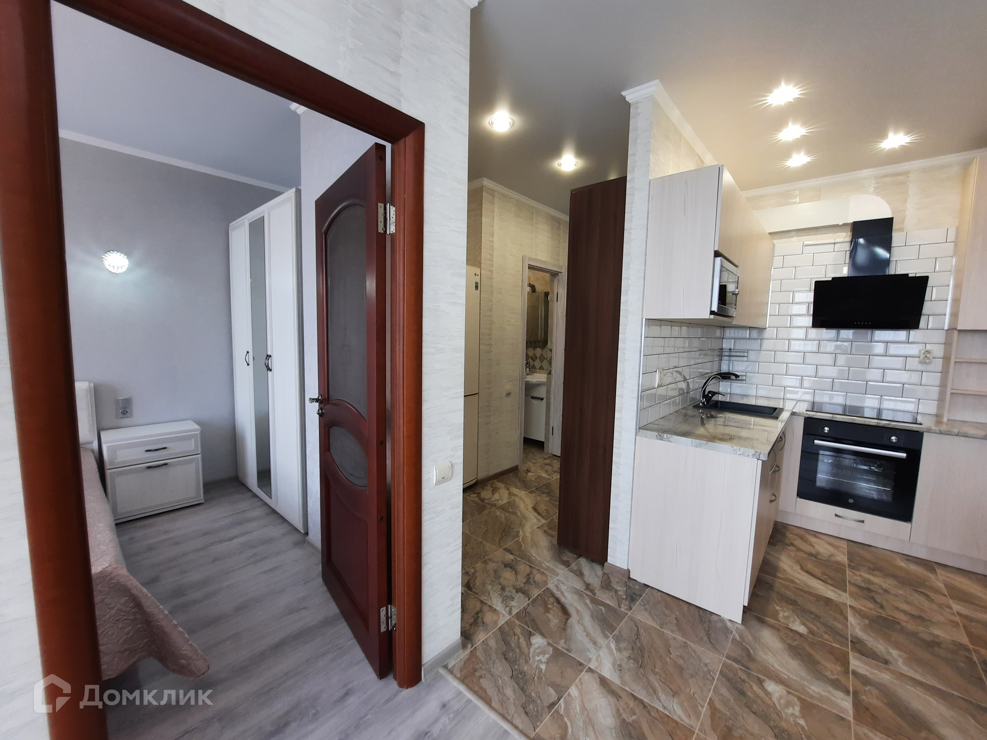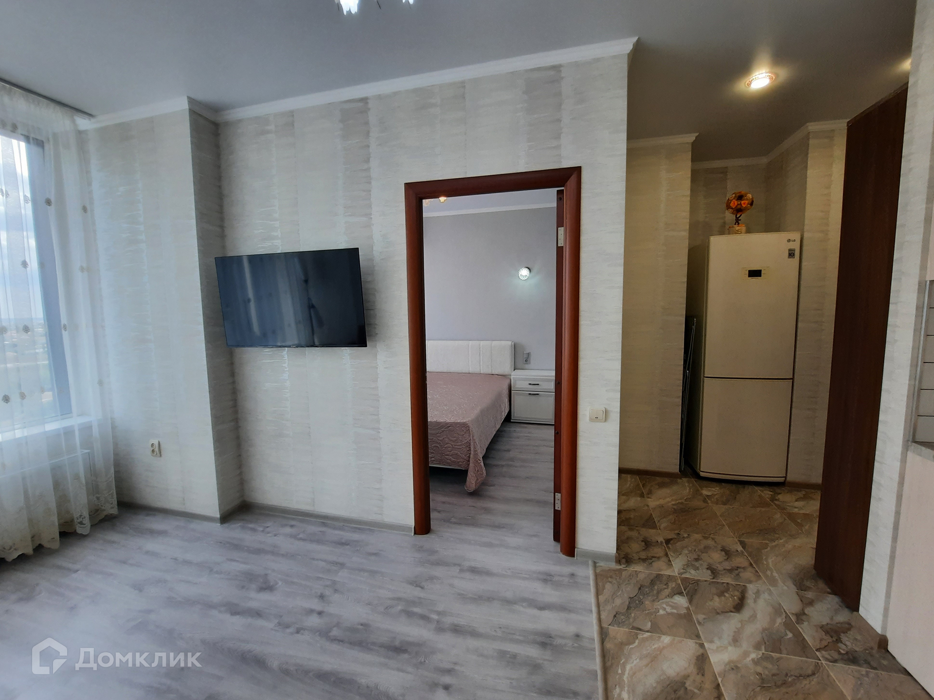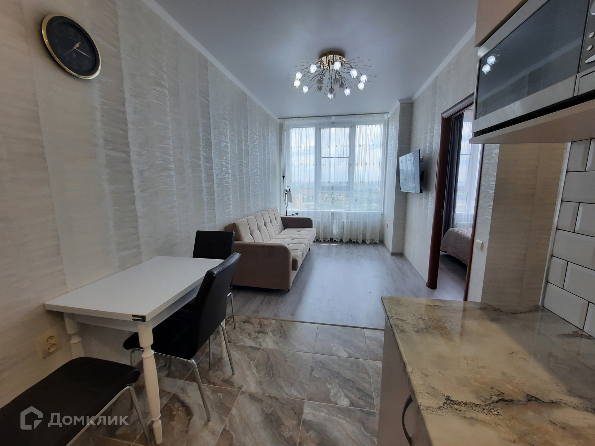 В кухне-гостиной установлена мебель со встроенной техникой: варочная панель, духовой шкаф; а так же микроволновая печь, вытяжка, фильтр очистки воды, двухкамерный холодильник, моющий пылесос. Обеденная группа с раскладным столом. Гостиная зона с диваном и жк-телевизором. В жилой комнате - двуспальная кровать, гардеробный шкаф, 2 тумбы, сплит-система. Входная группа с гардеробной мебелью. Санузел с тропическим душем, здесь установлена стиральная машина и полотенцесушитель.