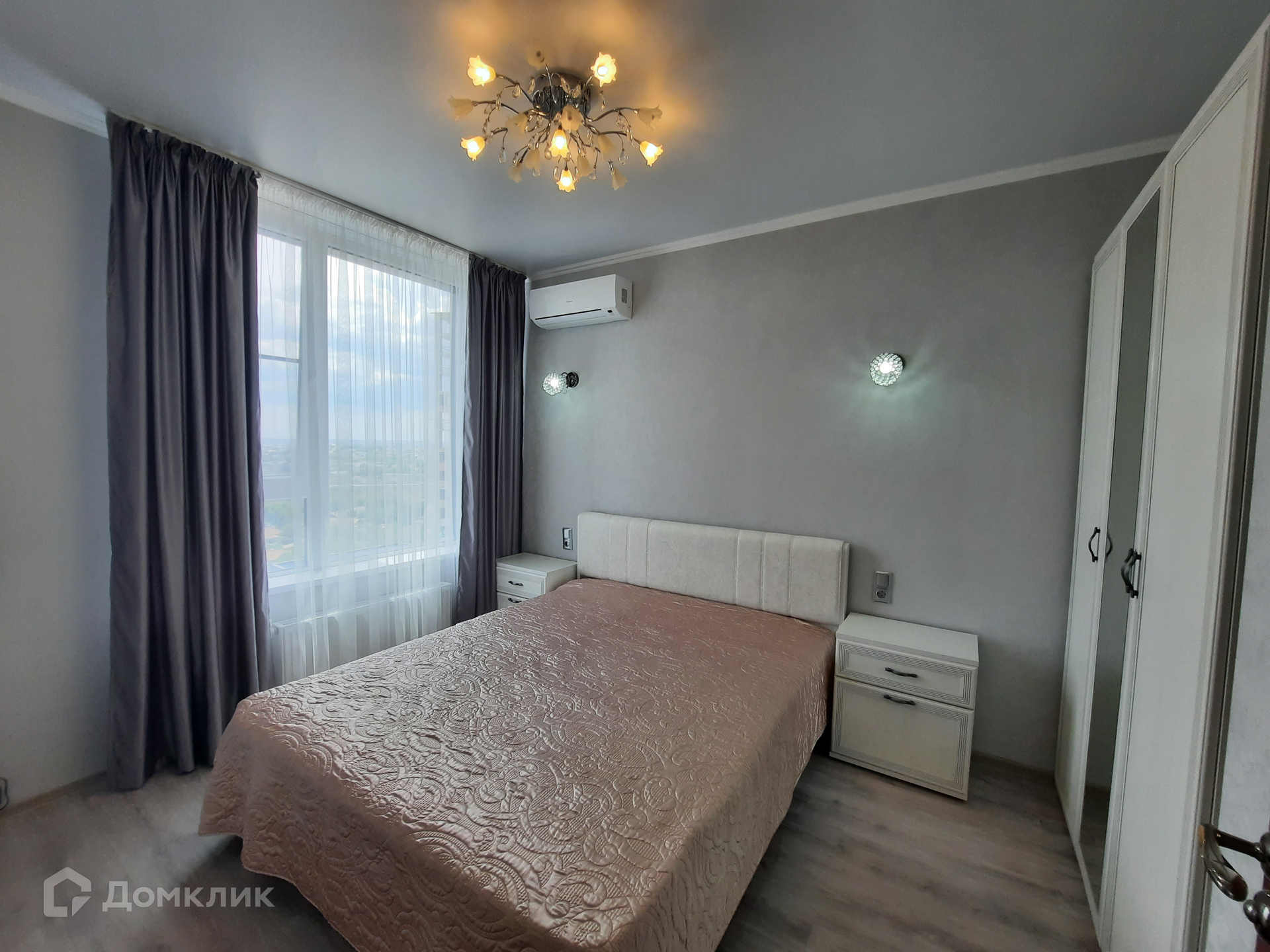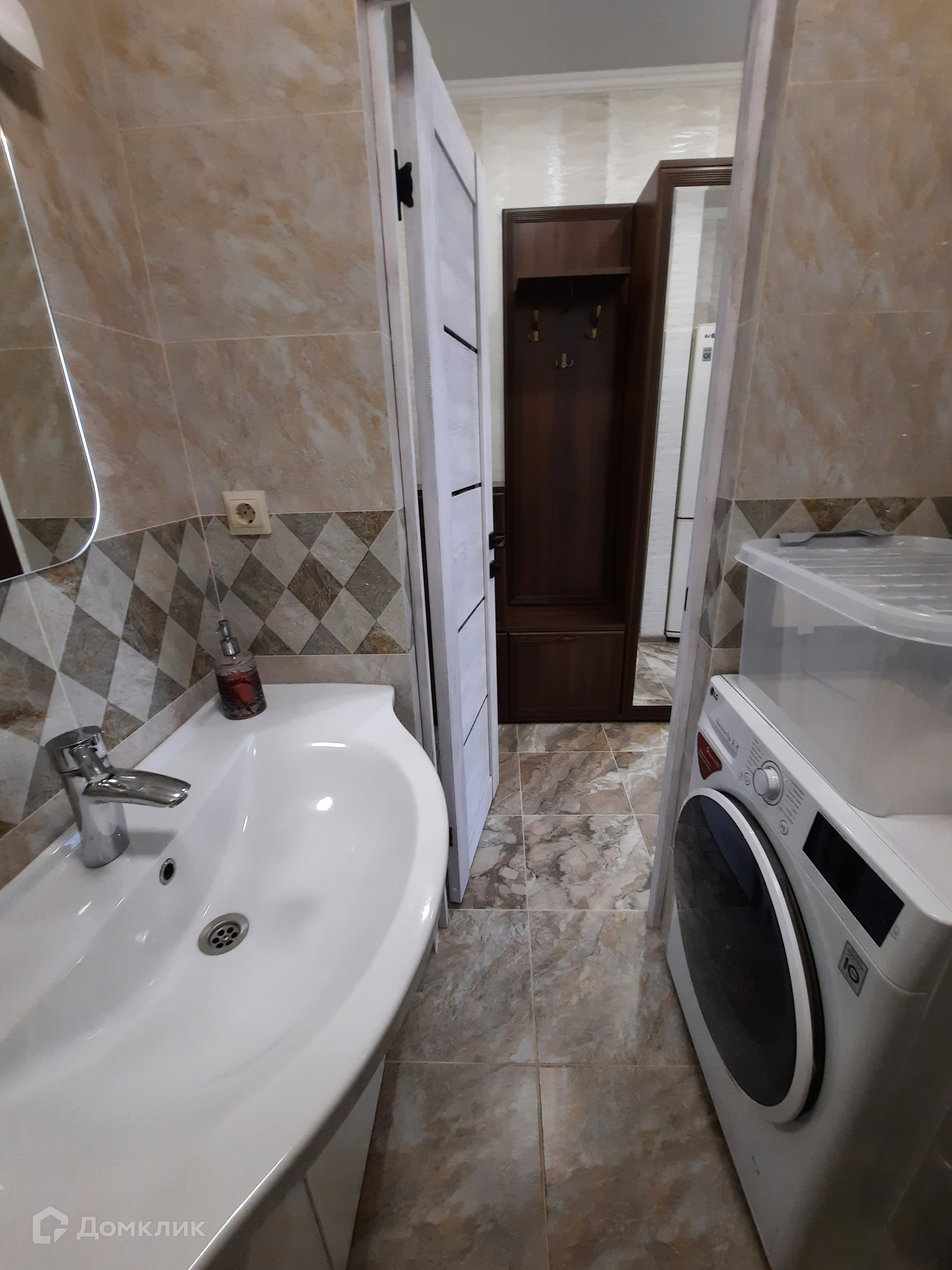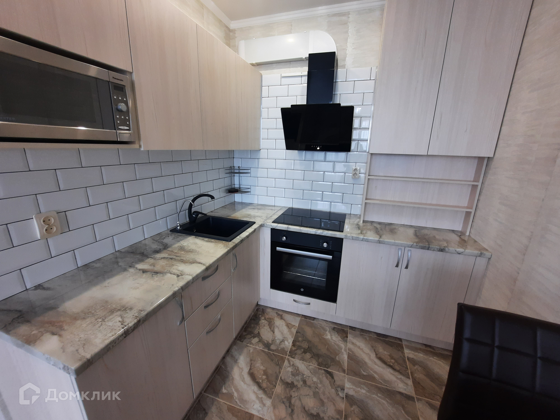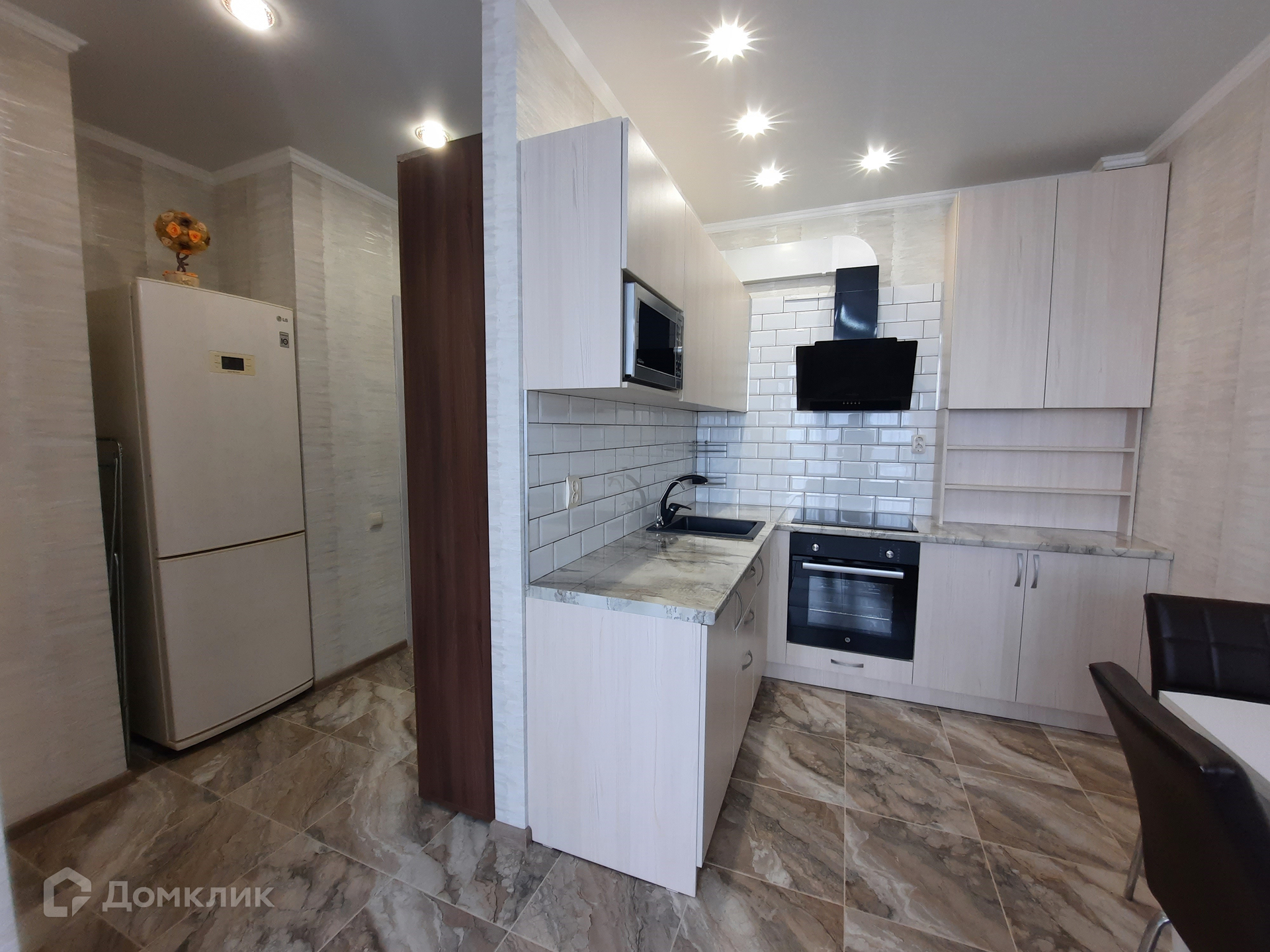 В кухне-гостиной установлена мебель со встроенной техникой: варочная панель, духовой шкаф; а так же микроволновая печь, вытяжка, фильтр очистки воды, двухкамерный холодильник, моющий пылесос. Обеденная группа с раскладным столом. Гостиная зона с диваном и жк-телевизором. В жилой комнате - двуспальная кровать, гардеробный шкаф, 2 тумбы, сплит-система. Входная группа с гардеробной мебелью. Санузел с тропическим душем, здесь установлена стиральная машина и полотенцесушитель.