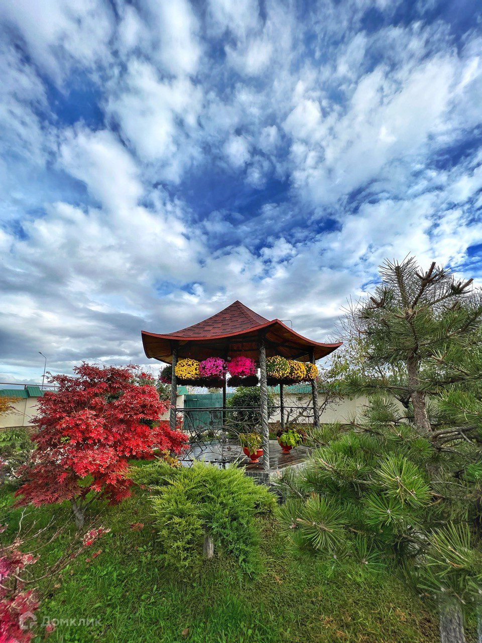 На территории также находится гараж с пристроенным навесом, две беседки, два колодца, артезианская скважина, два навеса для хозяйственных нужд.