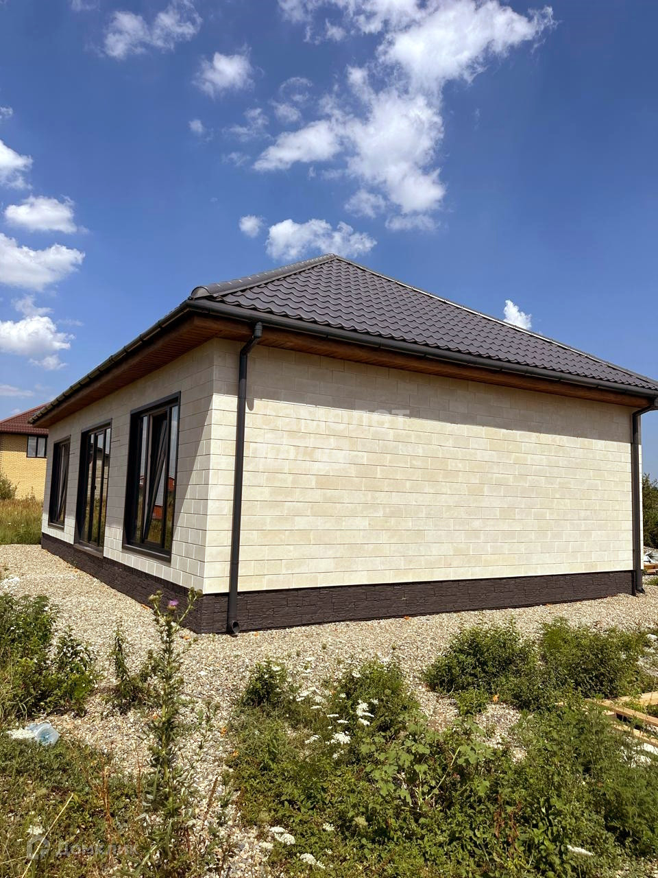 Цоколь утеплён ЭППС Пеноплекс 50 мм и облицован цокольными панелями Деке. Водосточная система — Деке Премиум.