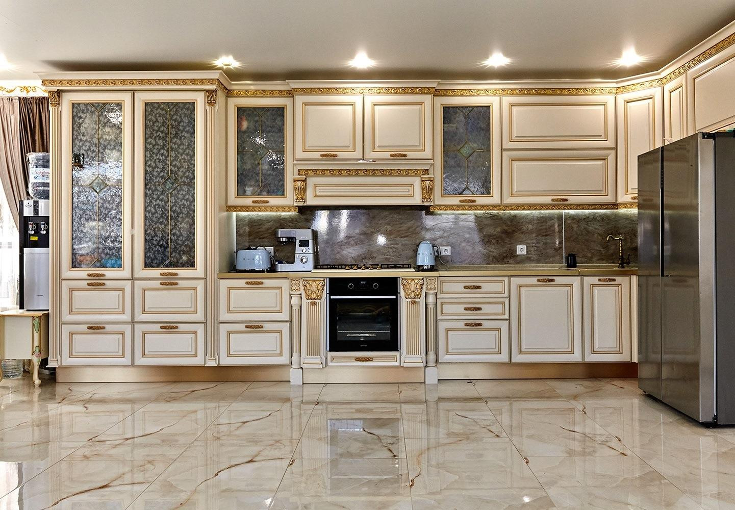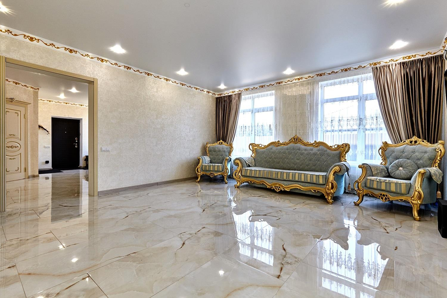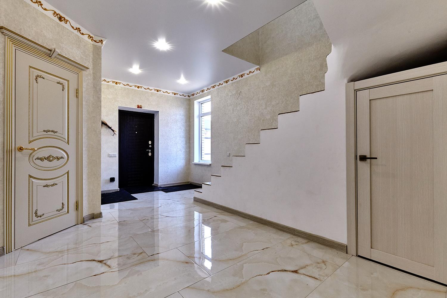 Выполнен дизайнерский ремонт из материалов премиум класса, установлены межкомнатные двери из массива под лаком, новая кухня с итальянскими натуральными фасадами и встроенной техникой производства Германии, дорогостоящая сантехника и смесители, на первом этаже водяные теплые полы, на втором - электрические.