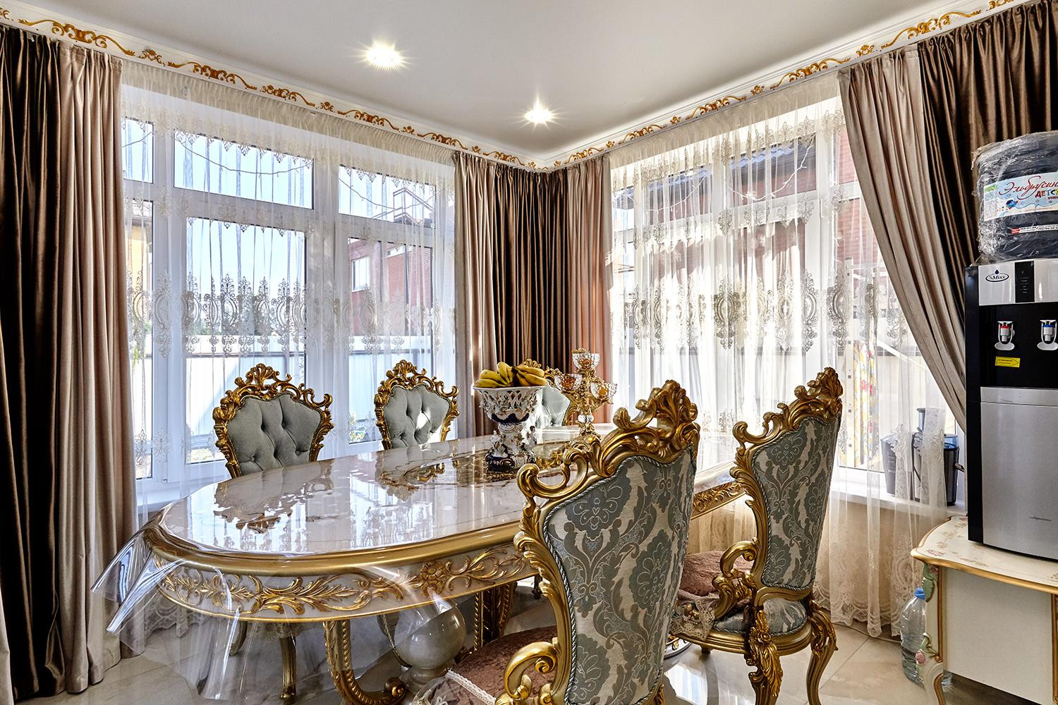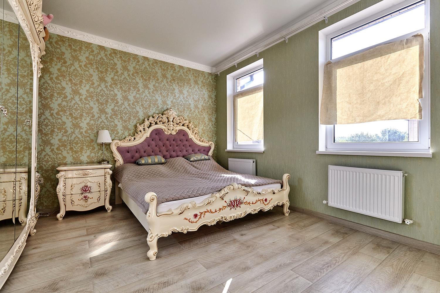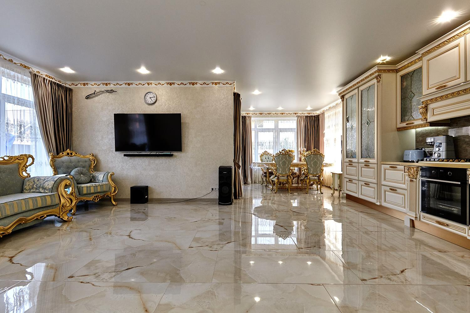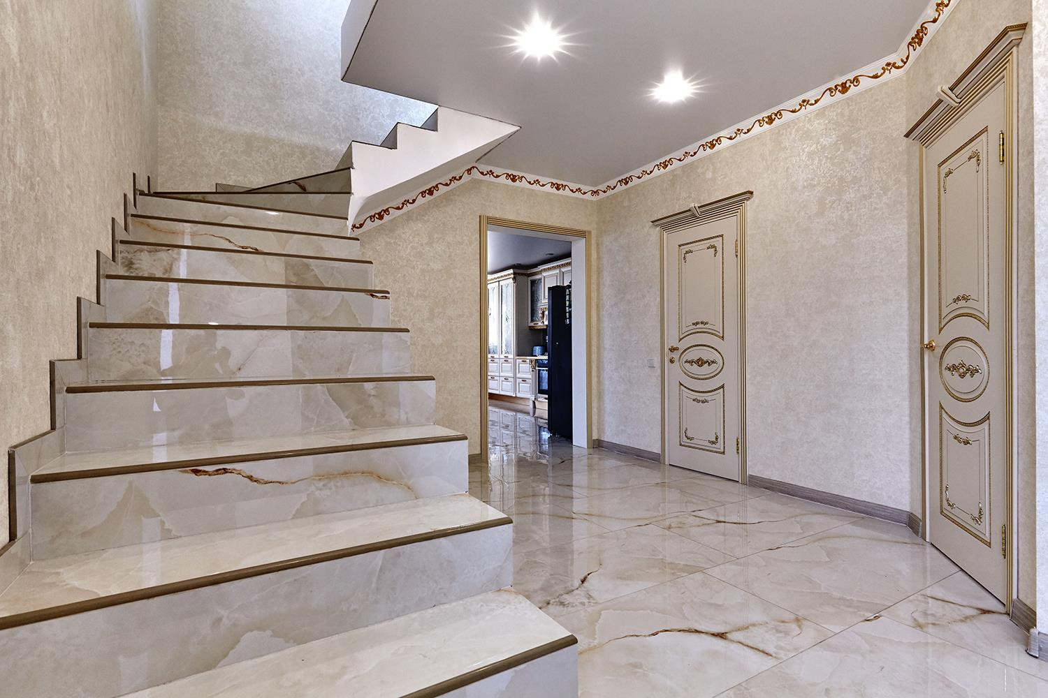 Выполнен дизайнерский ремонт из материалов премиум класса, установлены межкомнатные двери из массива под лаком, новая кухня с итальянскими натуральными фасадами и встроенной техникой производства Германии, дорогостоящая сантехника и смесители, на первом этаже водяные теплые полы, на втором - электрические.