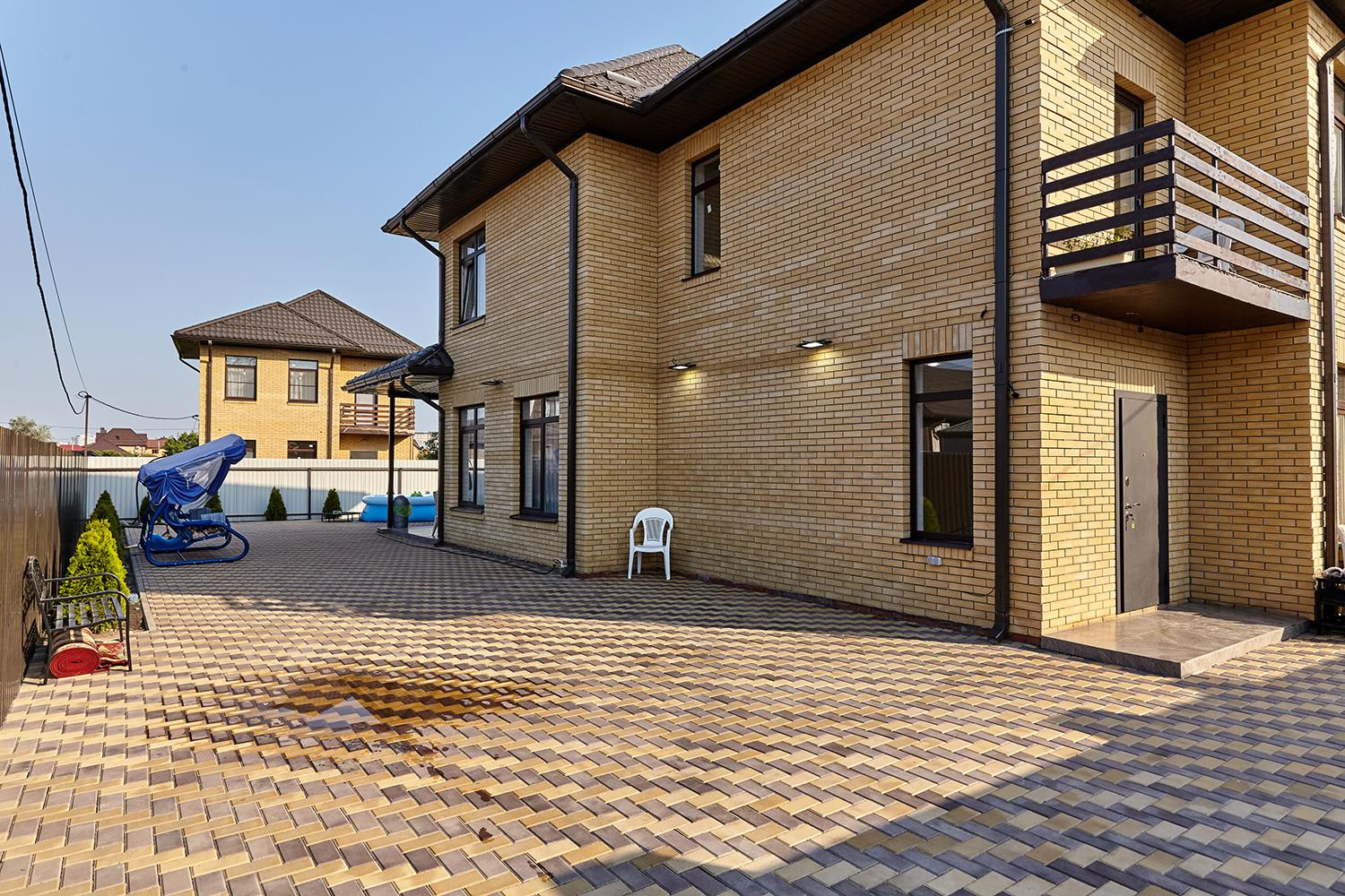 Участок огорожен по периметру забором, на въезде установлены откатные ворота, калитка. Перед домом есть места для парковки автомобилей, большая зона отчуждения. На заднем дворе - зона барбекю и место для установки бассейна, высажены молодые деревья и кустарники.