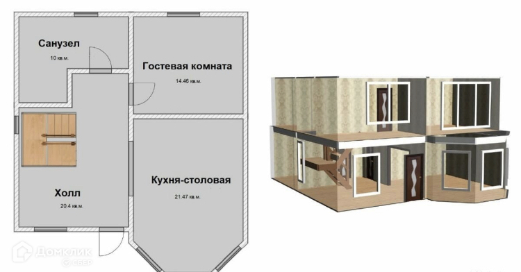 Первый этаж: прихожая, кухня - гостиная, спальня , санузел.