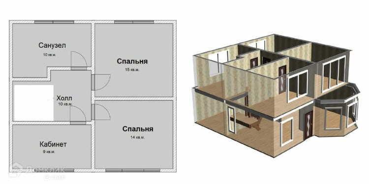 Второй этаж: две спальни, санузел, кабинет или детская спальня.
