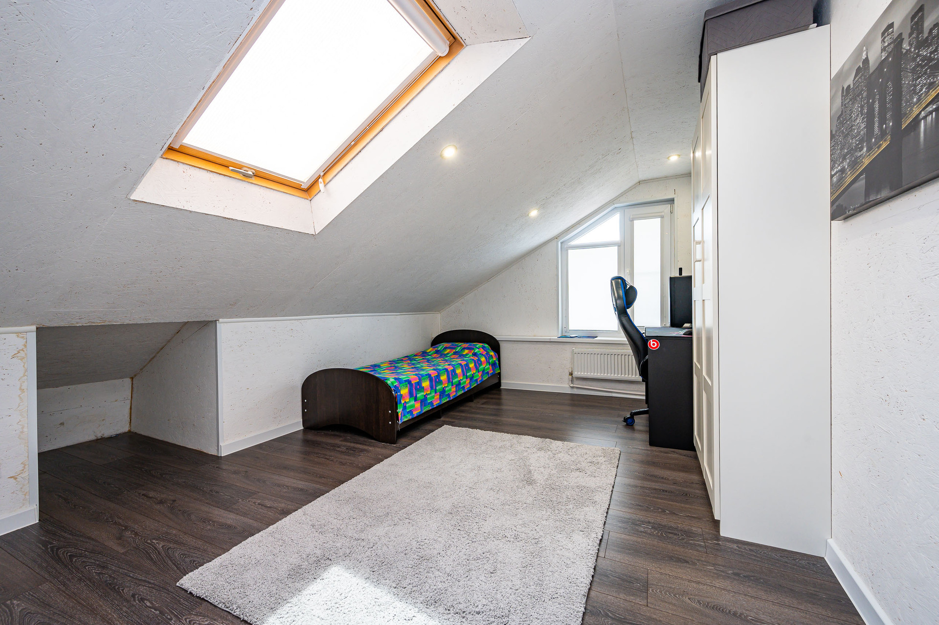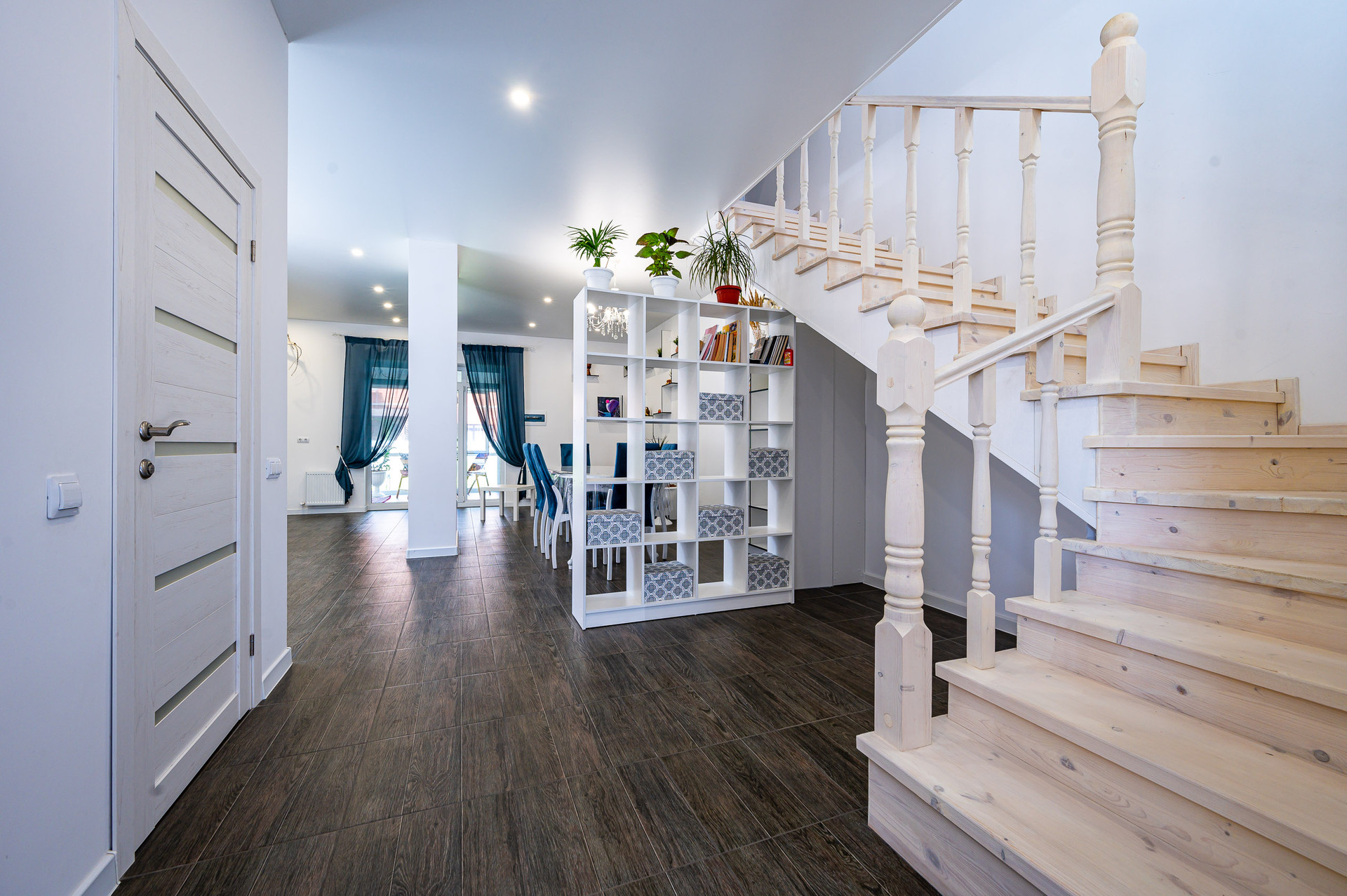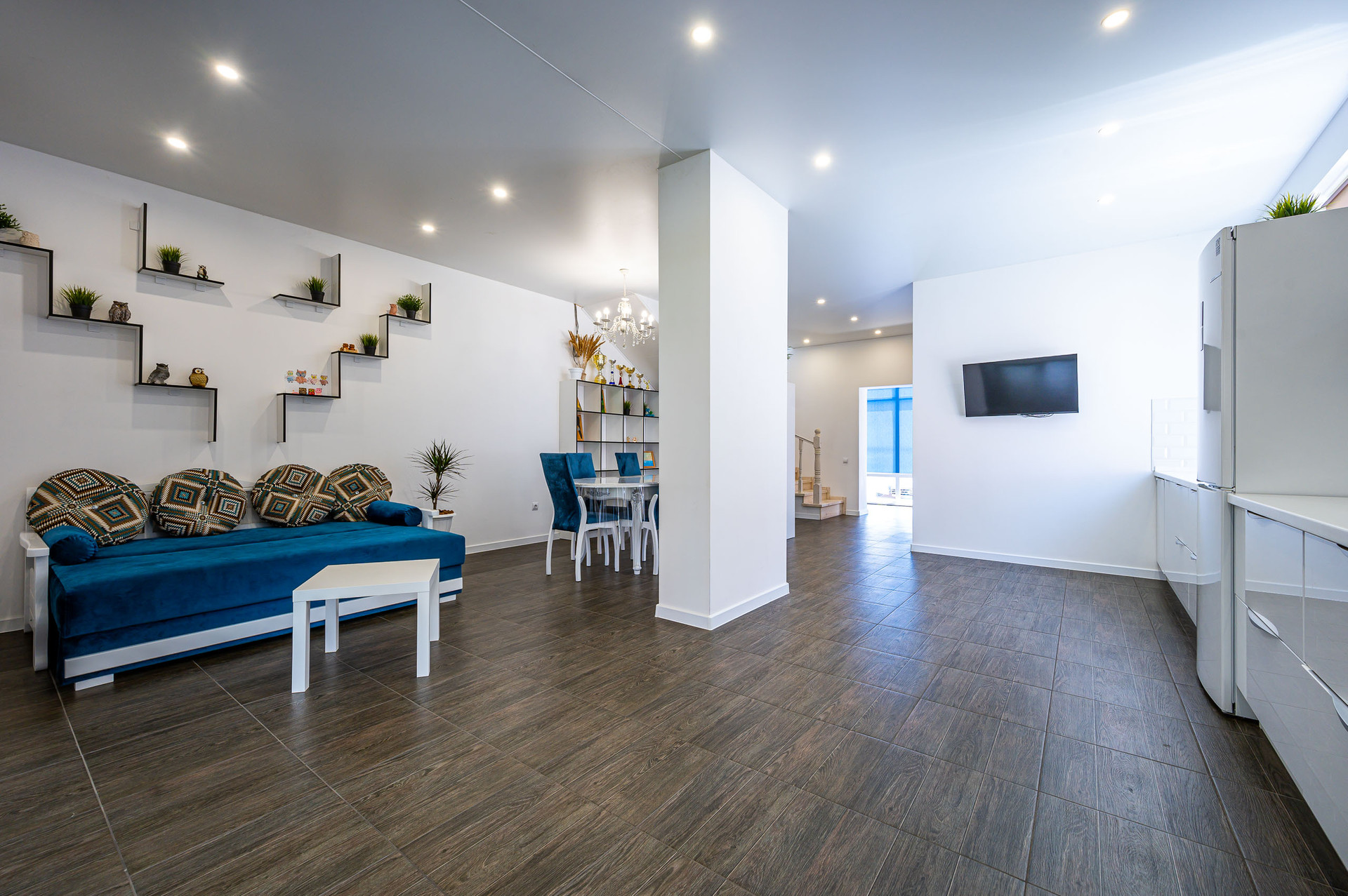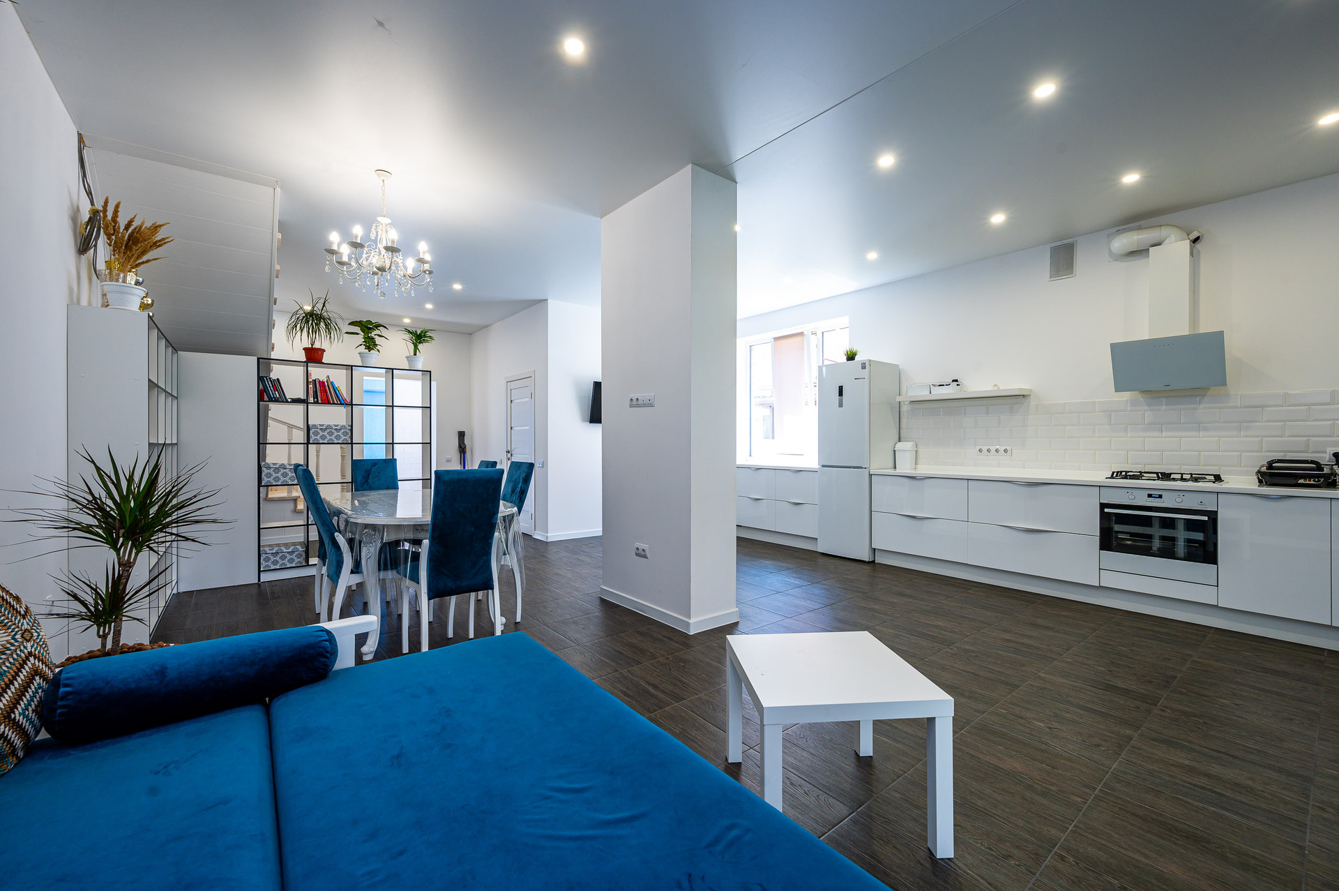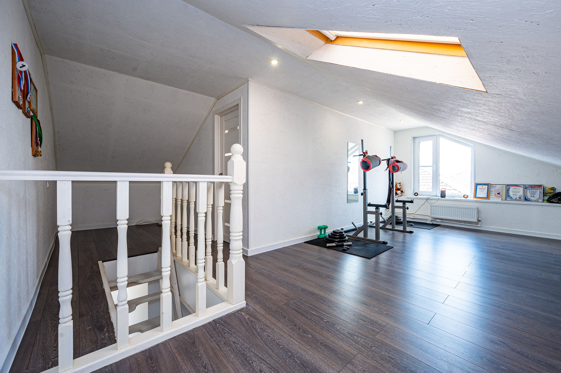 Первый этаж: прихожая, кухня-гостиная-столовая, кальянная, бойлерная (мастерская) + санузел с душевой и окном. Второй этаж: 3 комнаты + гардеробная, лоджия, санузел с ванной и окном. Третий этаж: спортивный зал, комната, панорамные окна.