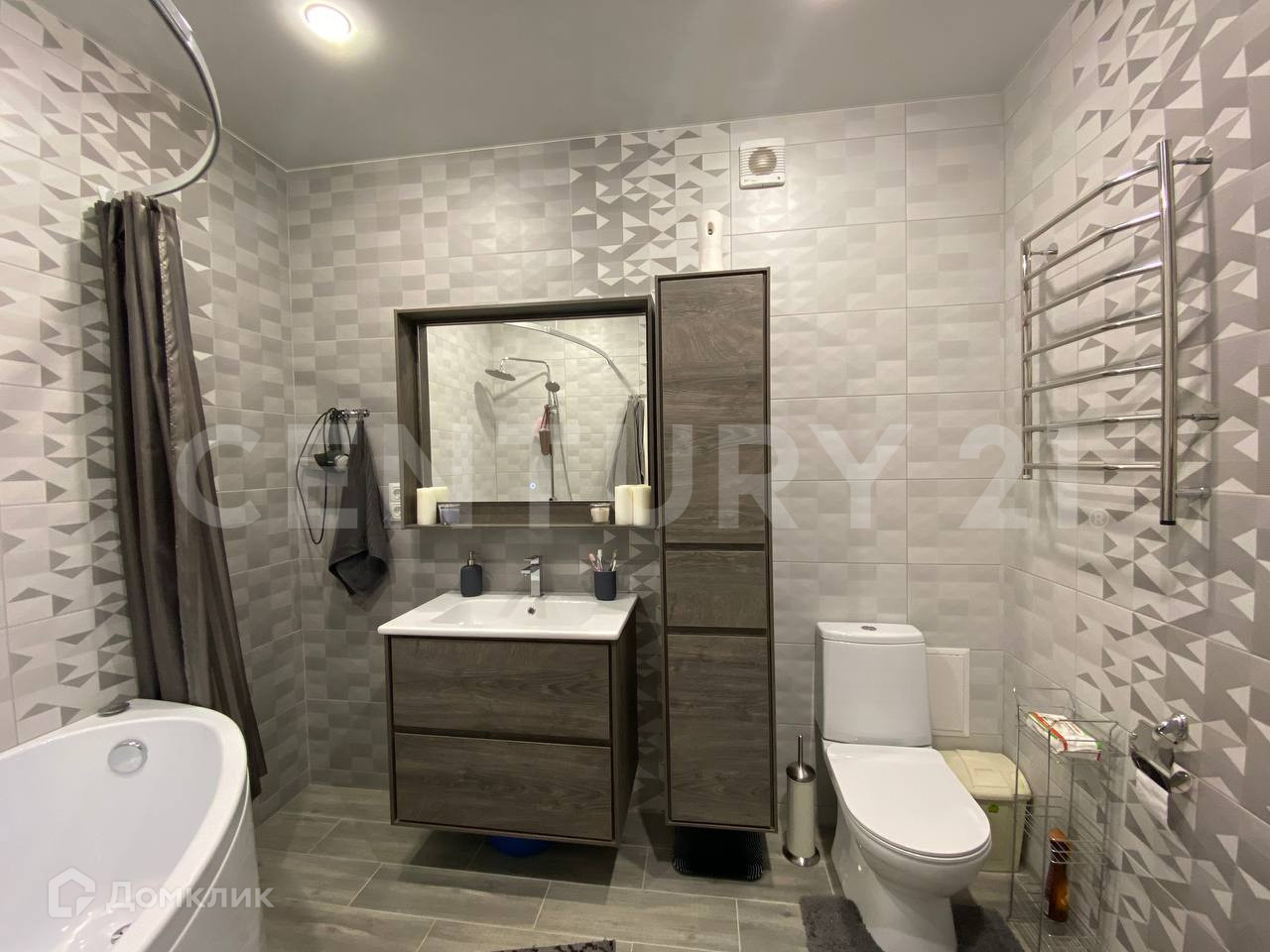 В квартире удобная планировка, с уютной кухней-гостиной. Одна комната занята под гардеробную. В санузле дорогой кафель, сантехника, мебель.