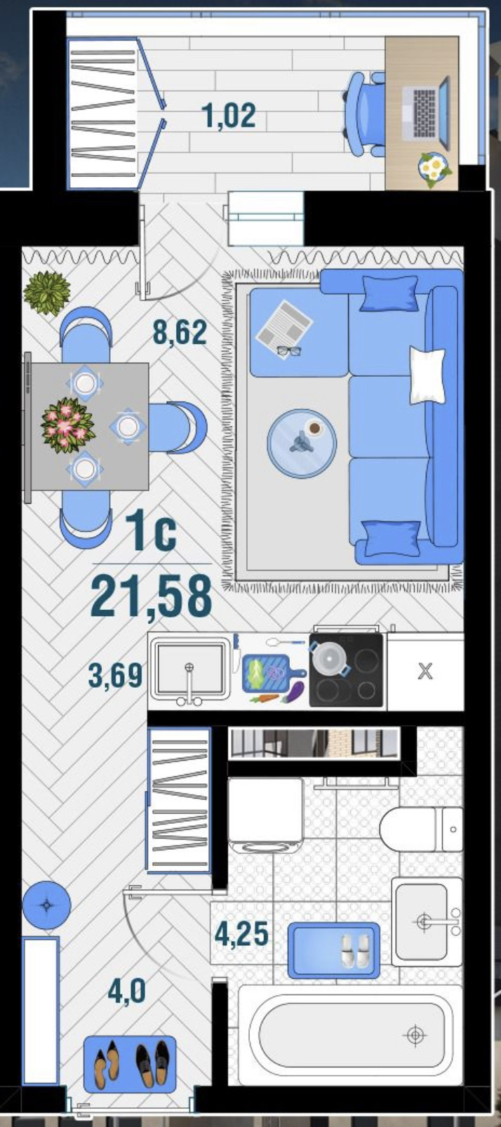 Общая площадь 21.58 м2