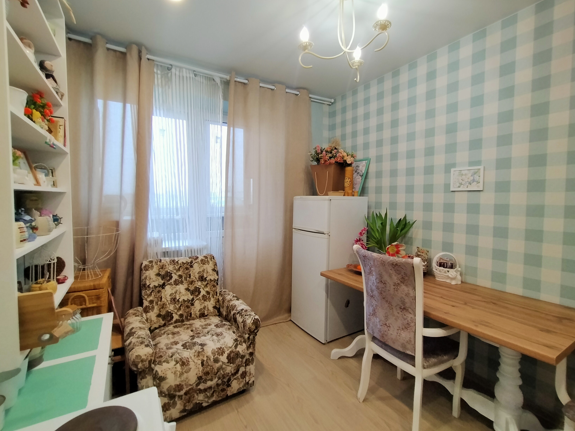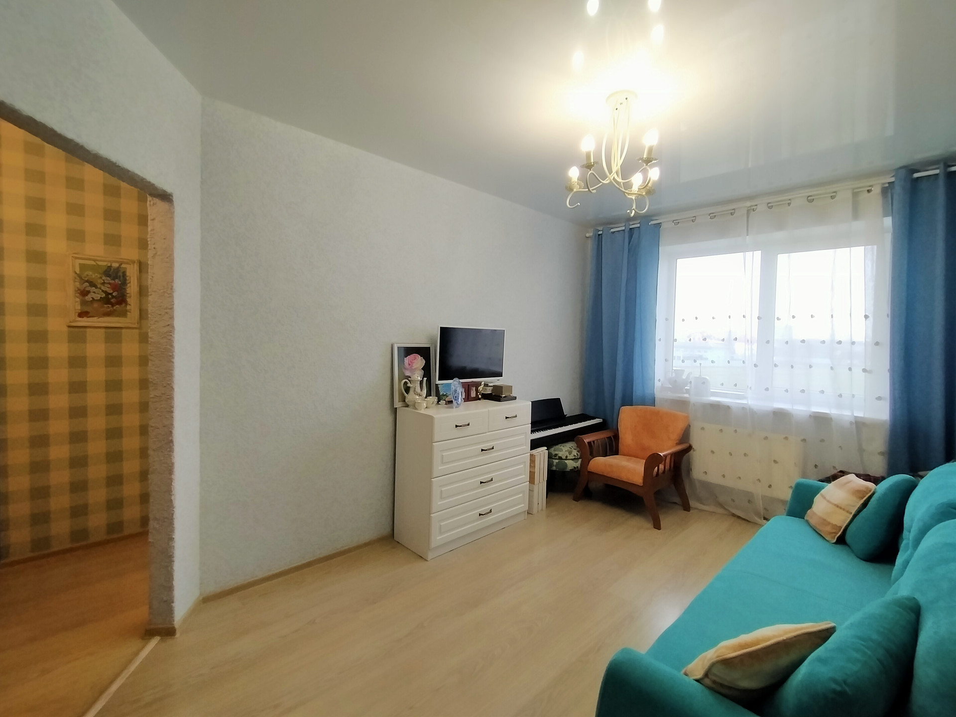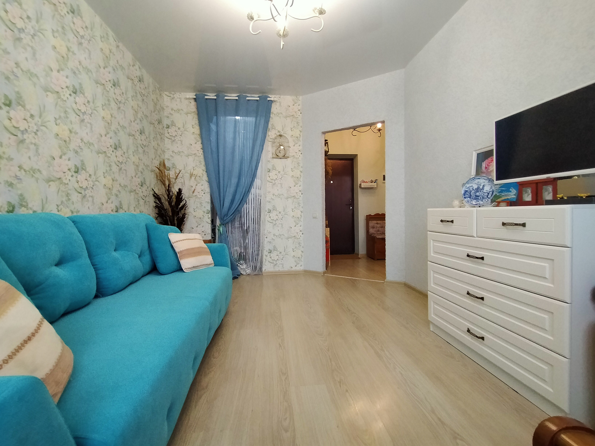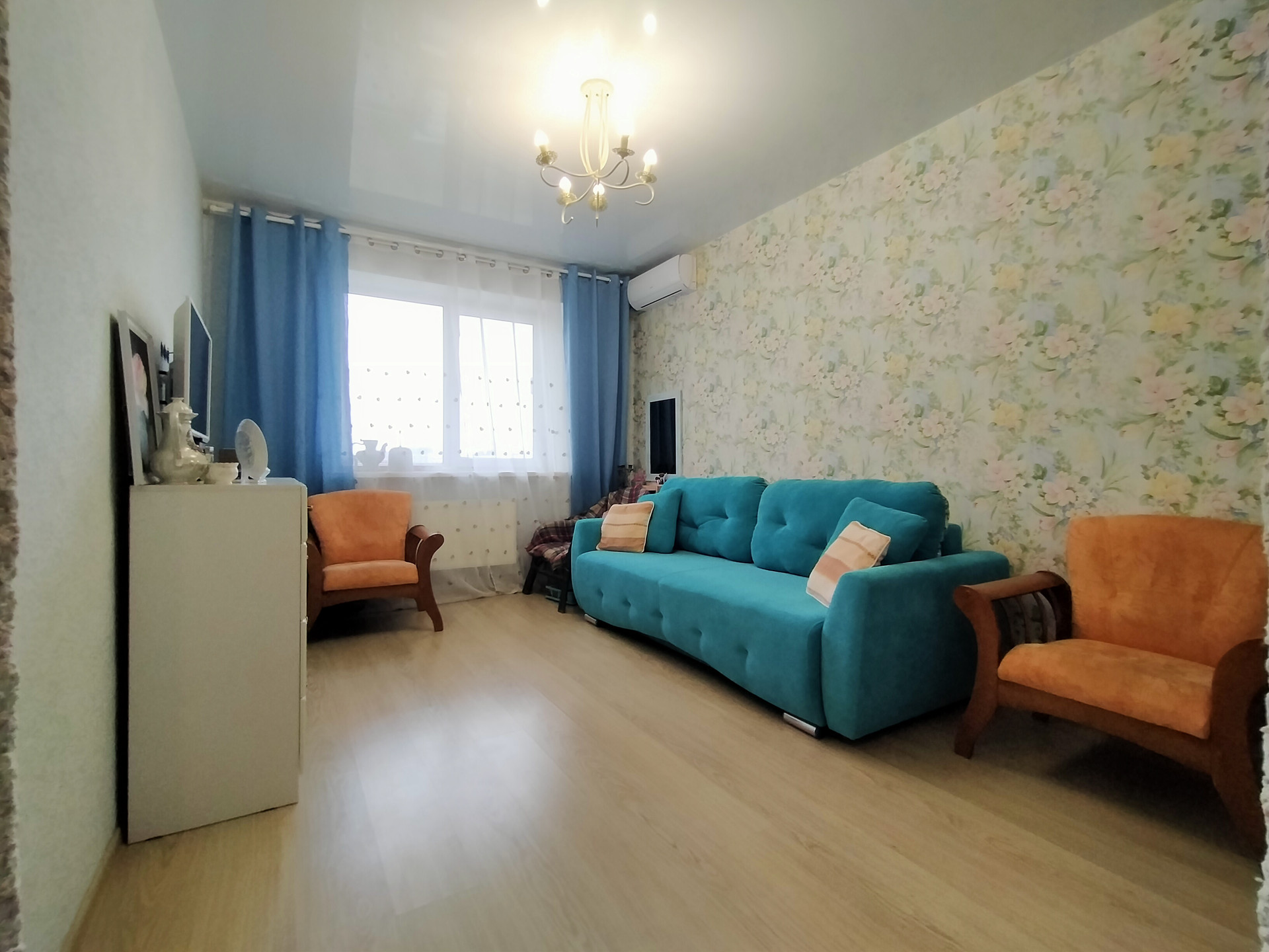 Жилая комната - 16,4 м2 и имеет отдельную гардеробную комнату - 2м2, стены - светлые обои с цветочным принтом, потолок натяжной с люстрой, на полу светлый ламинат. Мебель и техника остается по договоренности.