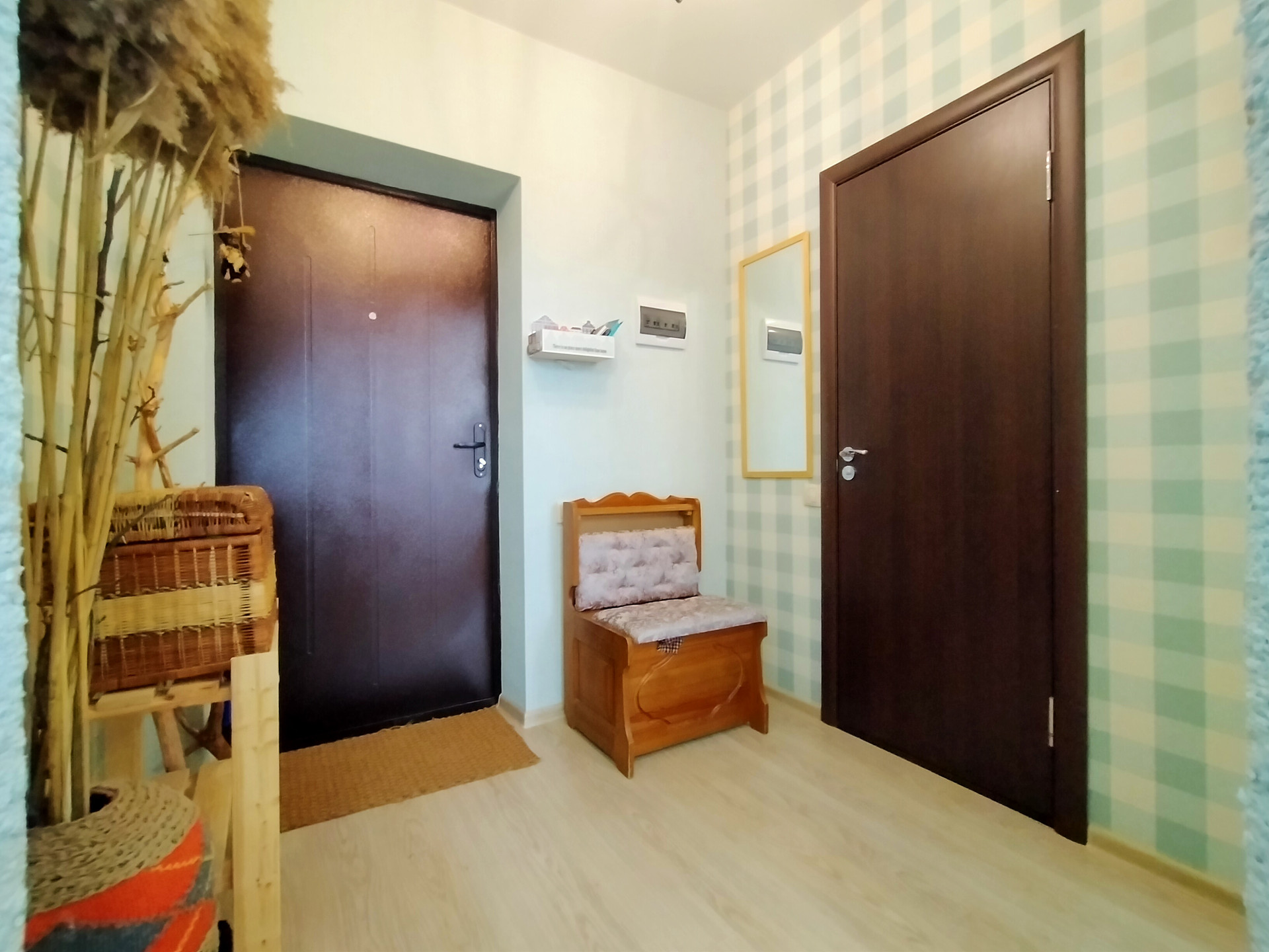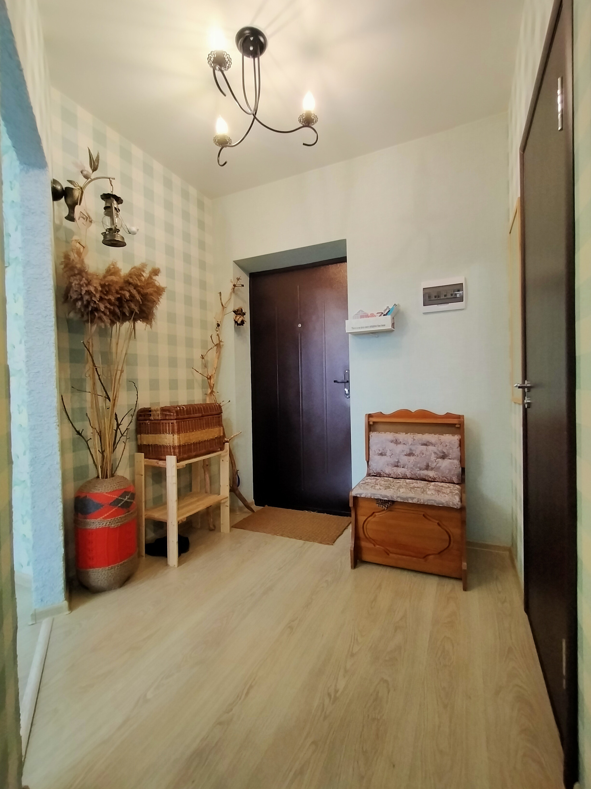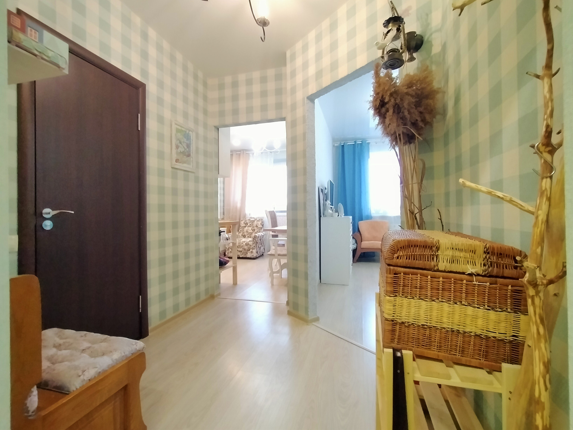 Прихожая - 4,1 м2, стены - обои, потолок - натяжной, на полу ламинат.