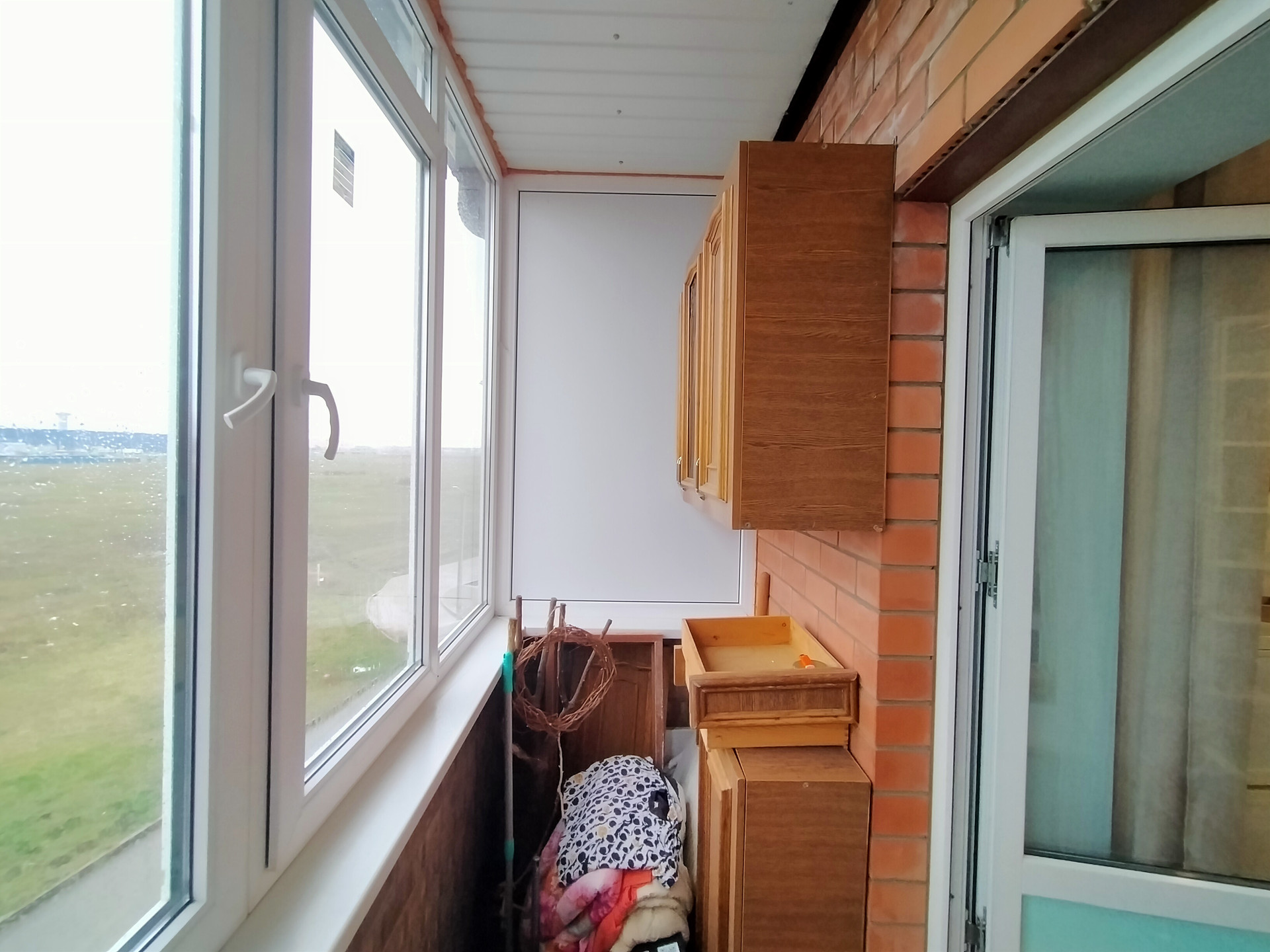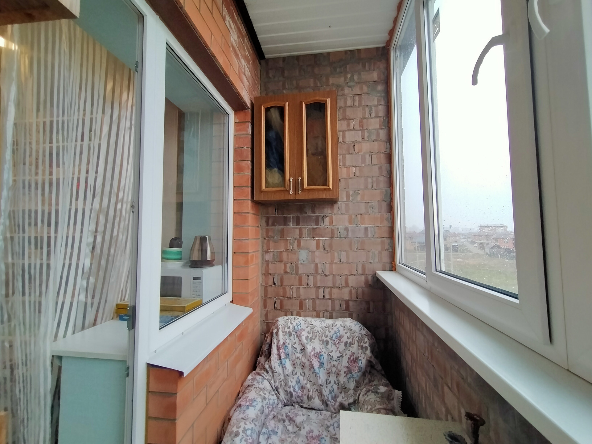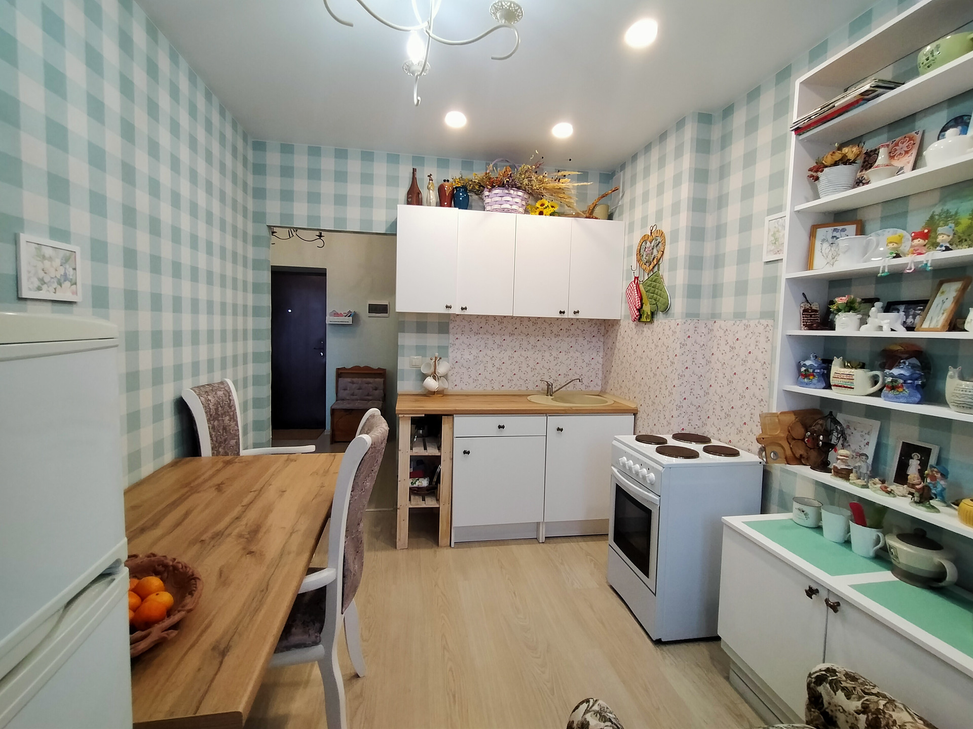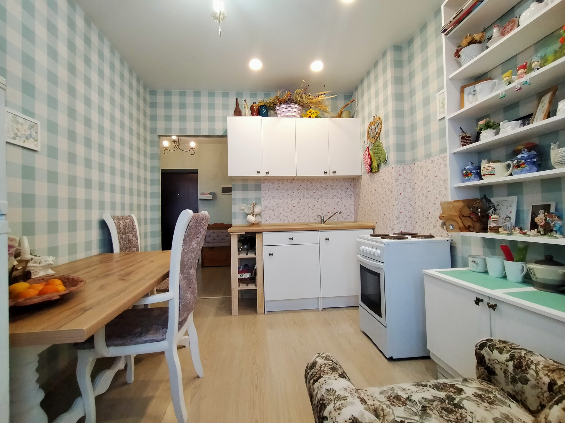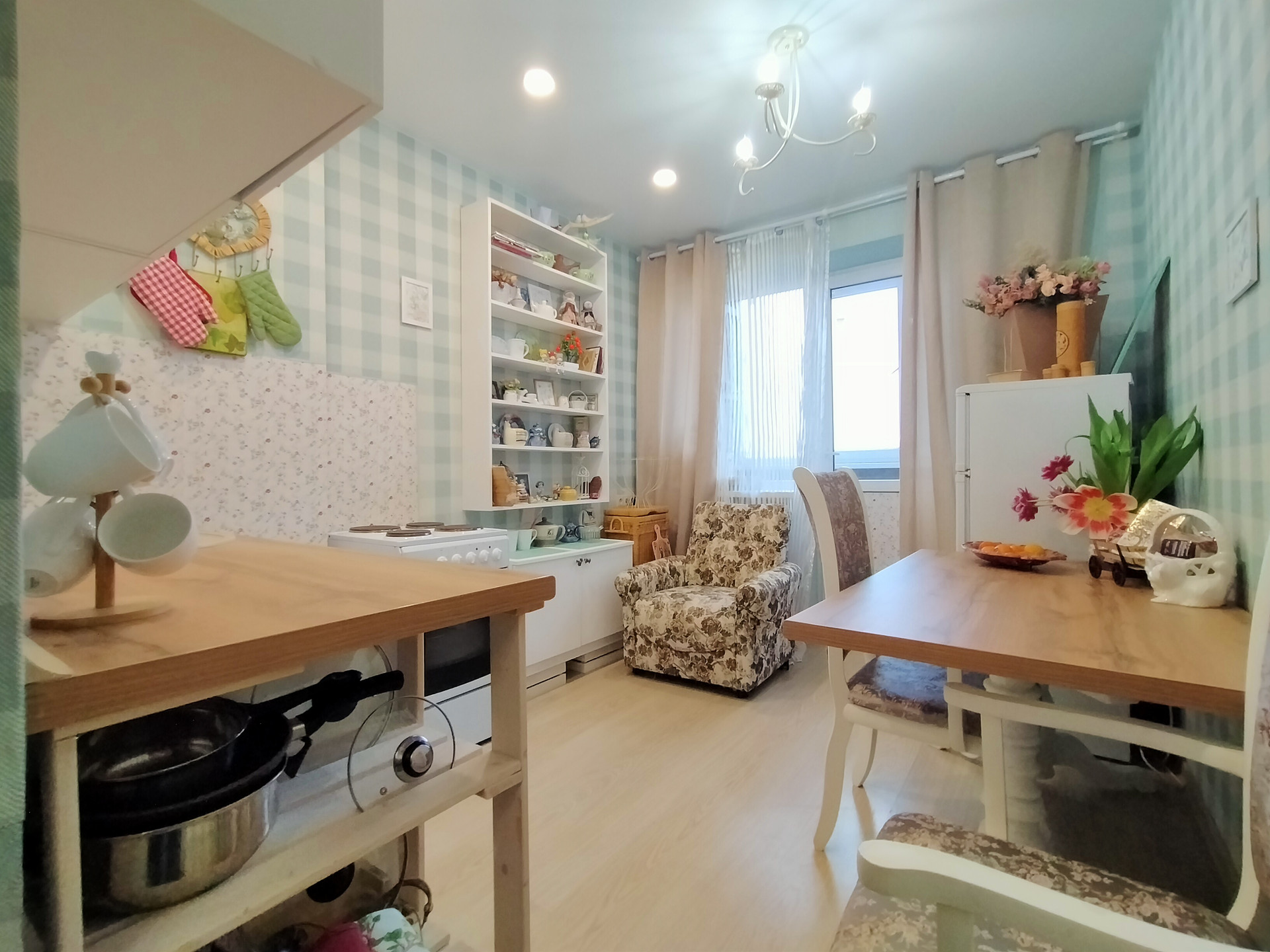 Кухня - 9,1 м2, с выходом на застекленный балкон. На стенах обои, на полу светлый ламинат, натяжной потолок. Окна пластиковые. Кухонный гарнитур, обеденный стол, стулья, электрическая плита. Техника и часть мебели остается при продаже.