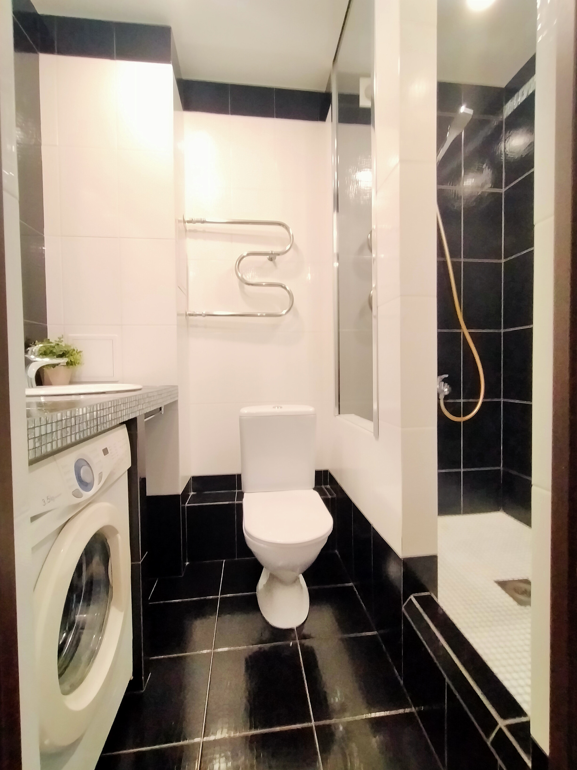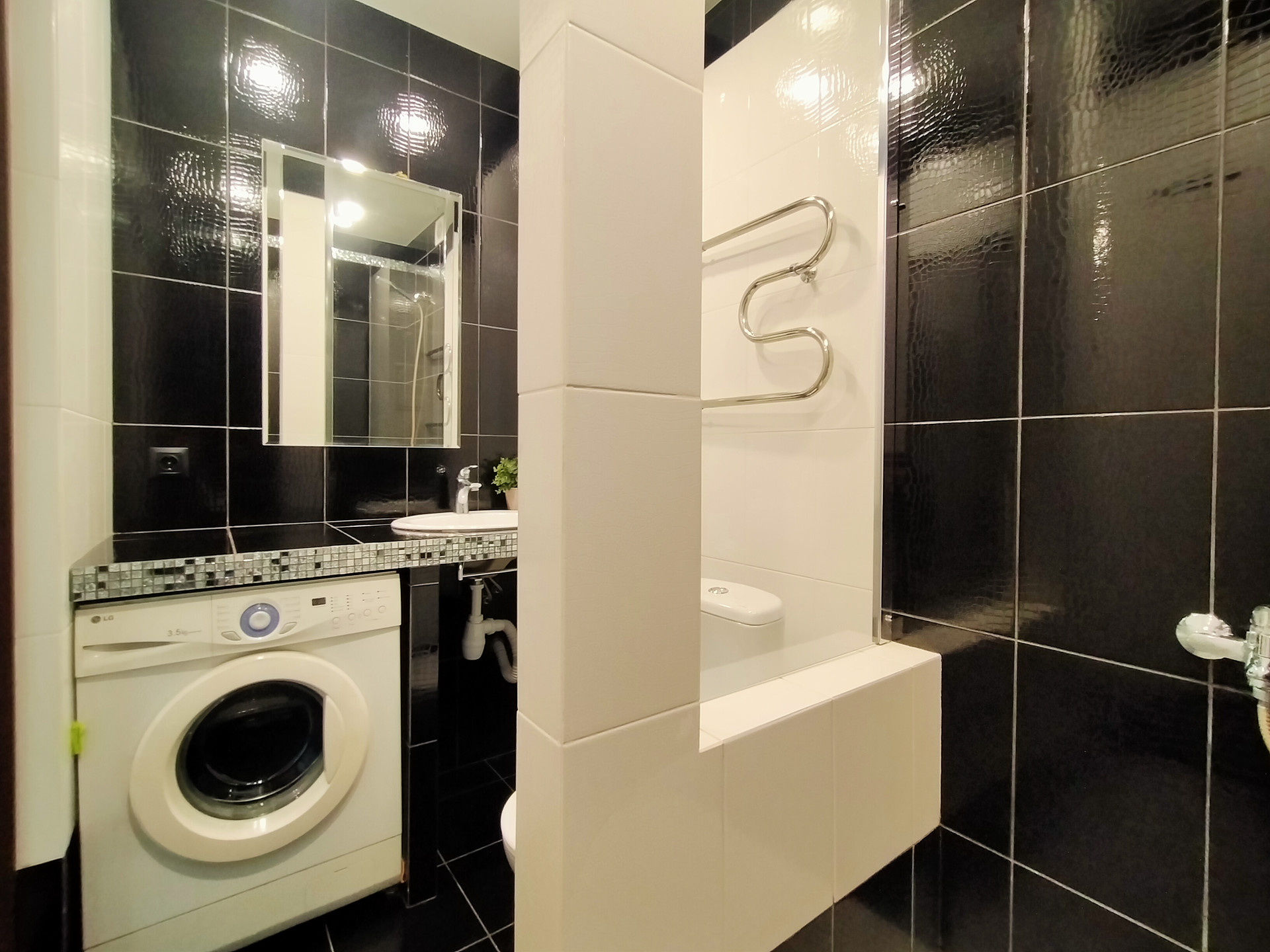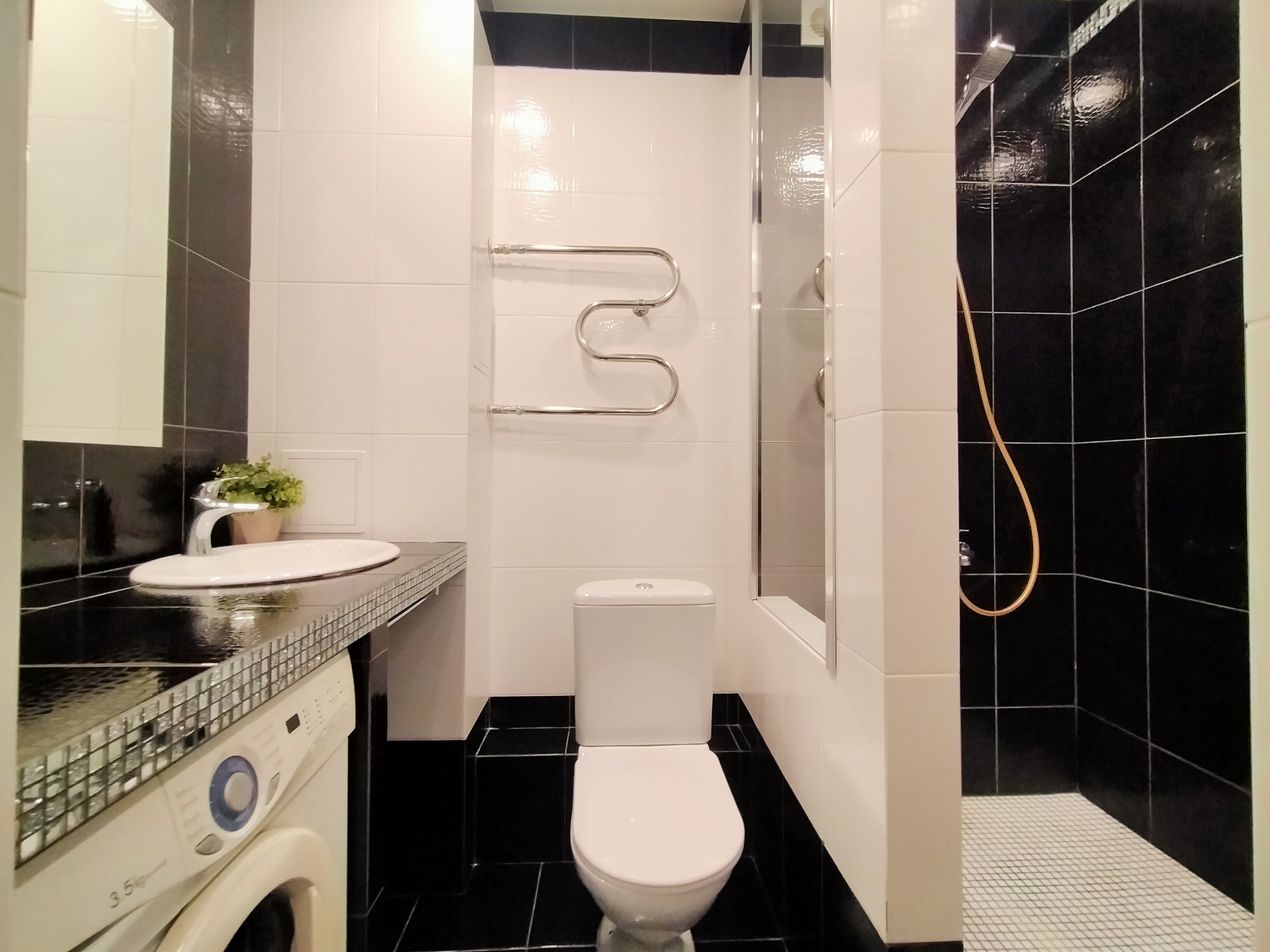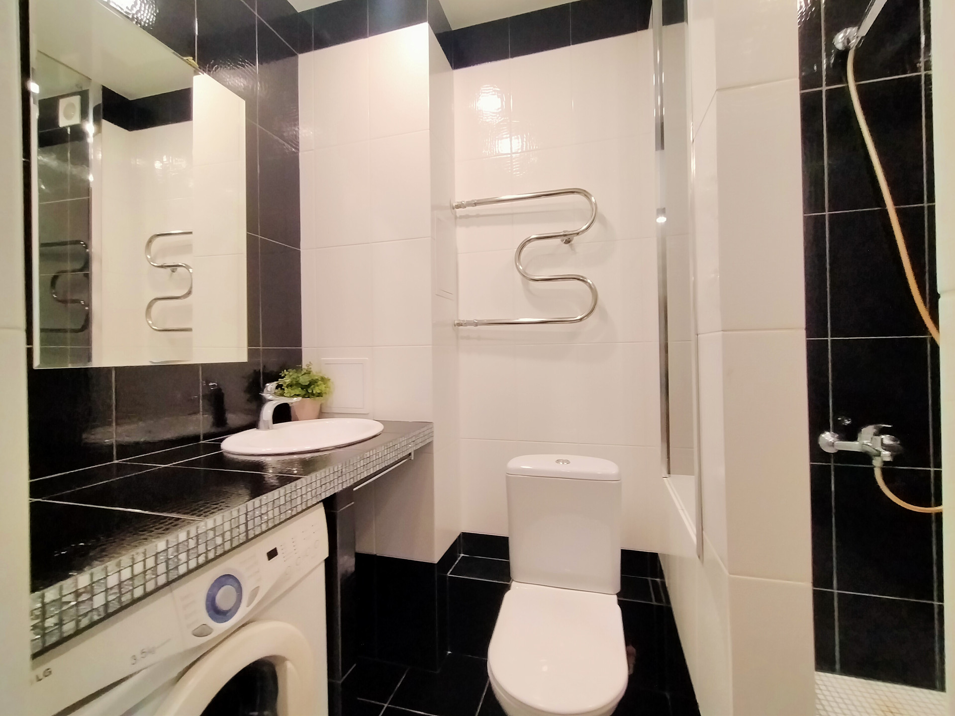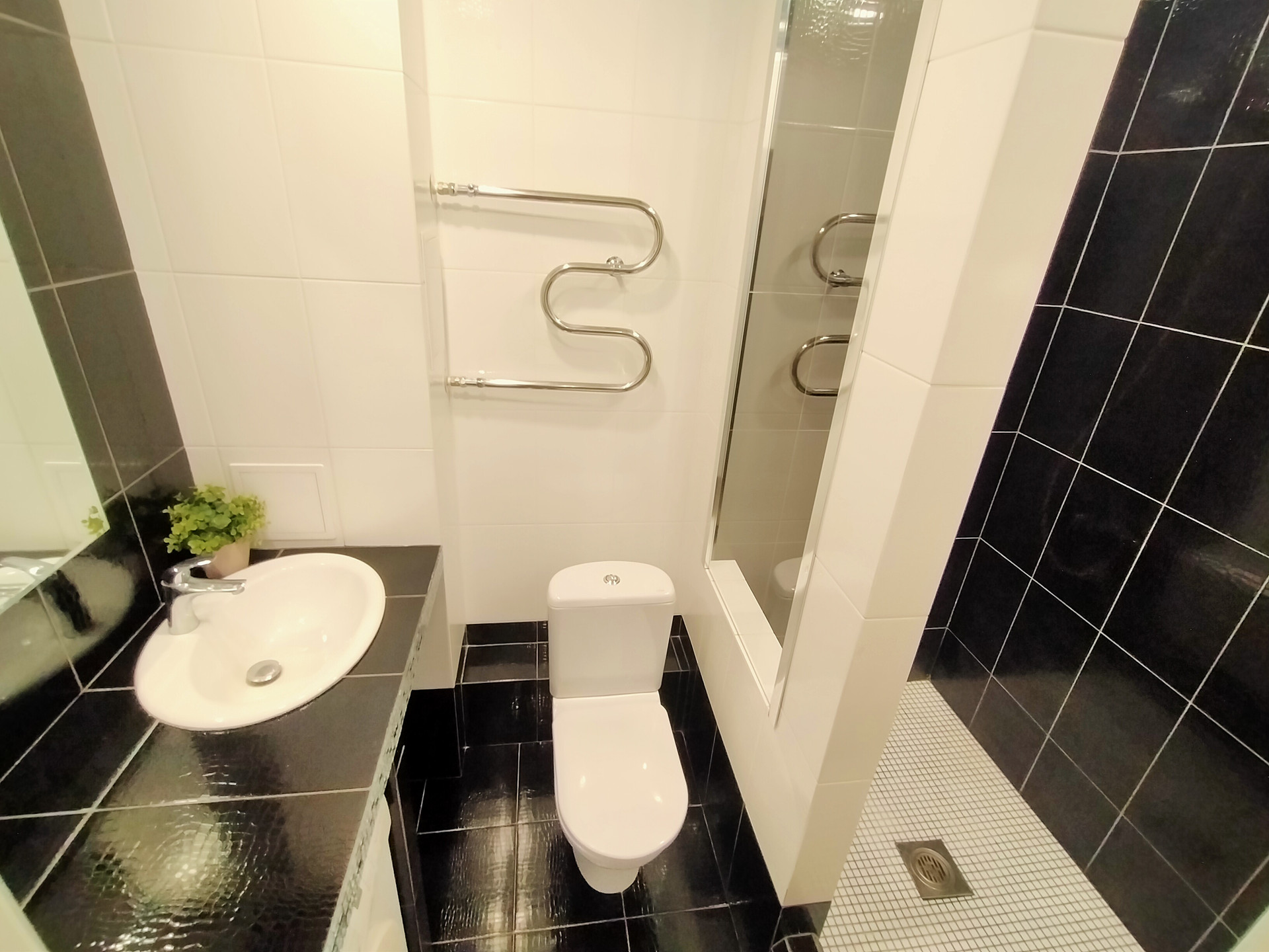 Санузел совмещенный - 3,7 м2, отделан кафельной плиткой в черно-белых тонах. Выполнен по дизайнерскому проекту. Зонирован на зону душевой и зону для умывания. Установлена хорошая раковина с красивой столешницей, унитаз и вся сантехника, потолок натяжной.