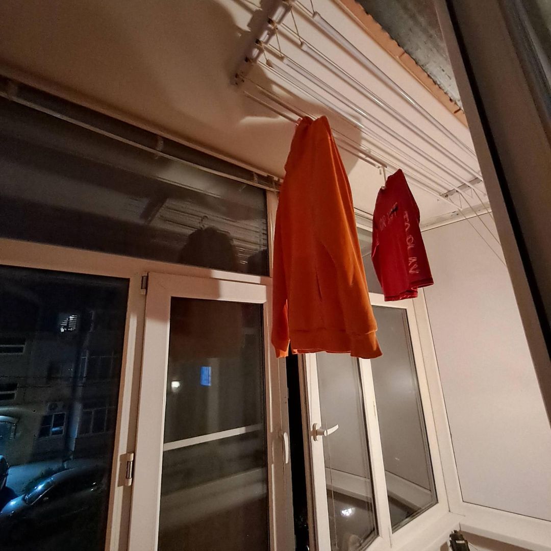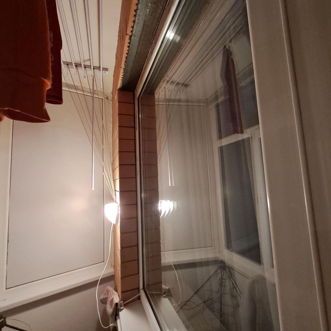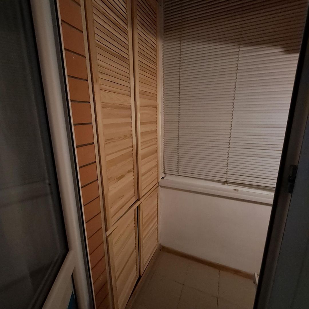Балкон застеклен, шкаф для хранения, выведен свет, потолочная сушилка, металлические жалюзи.
