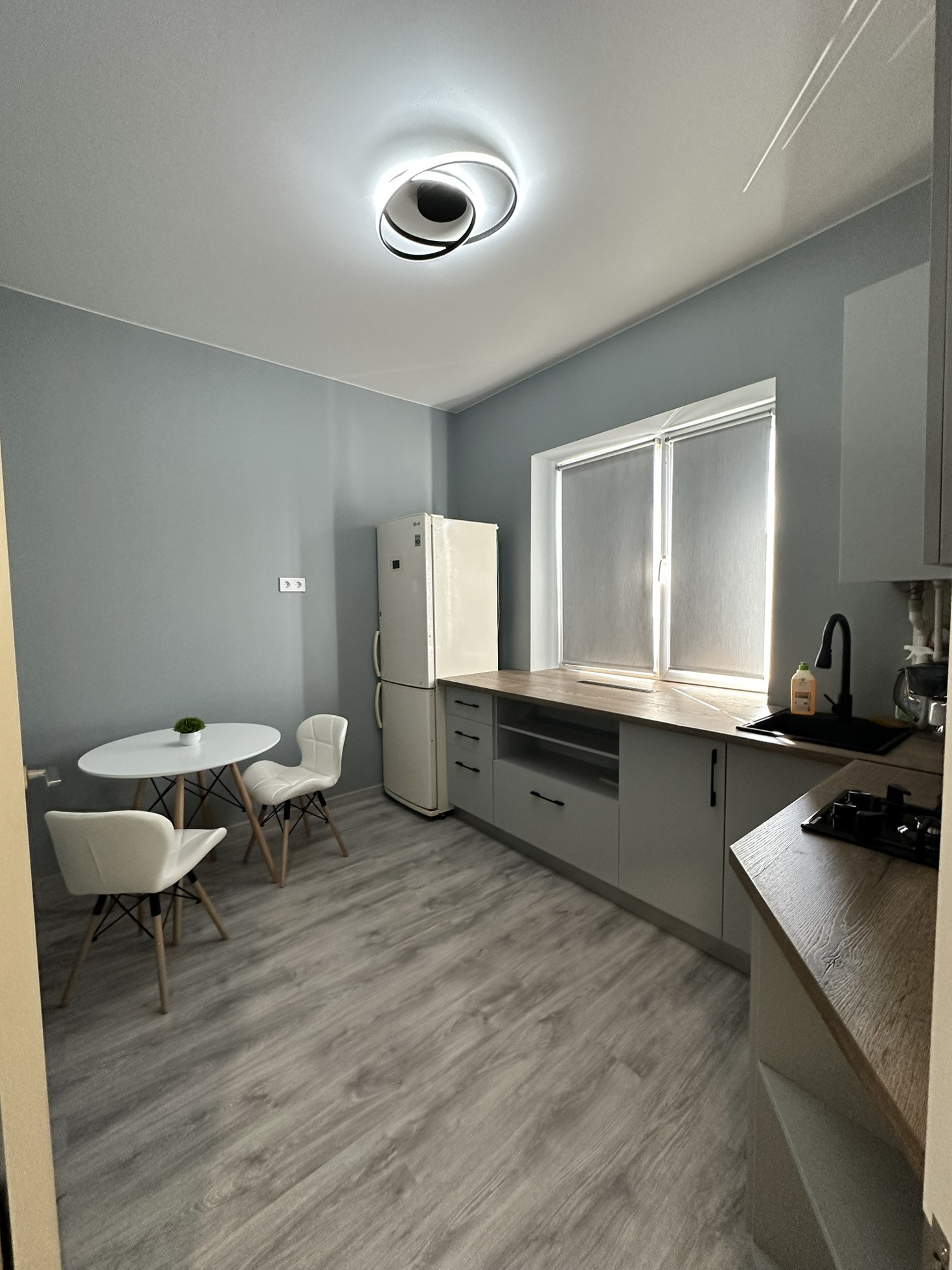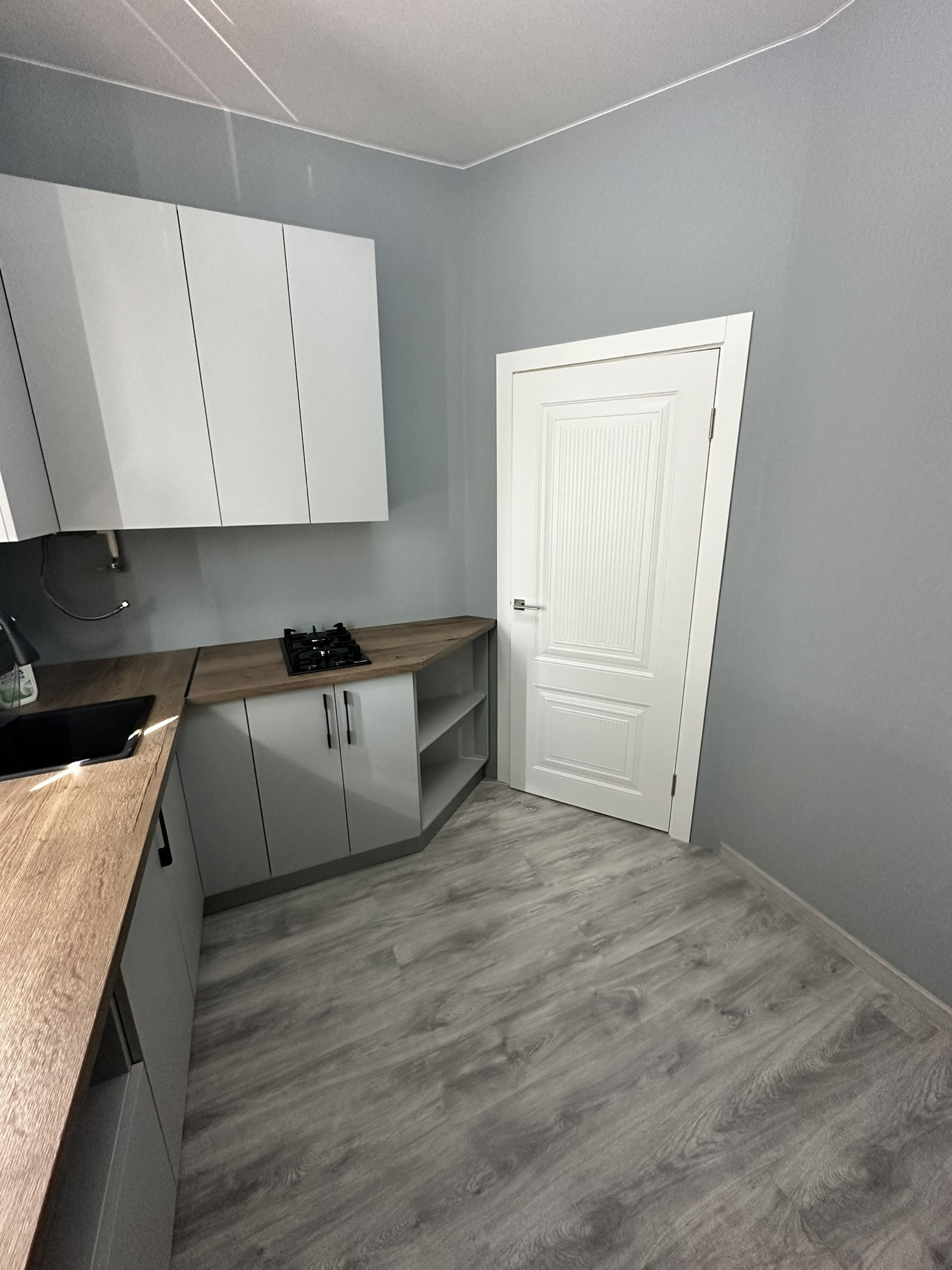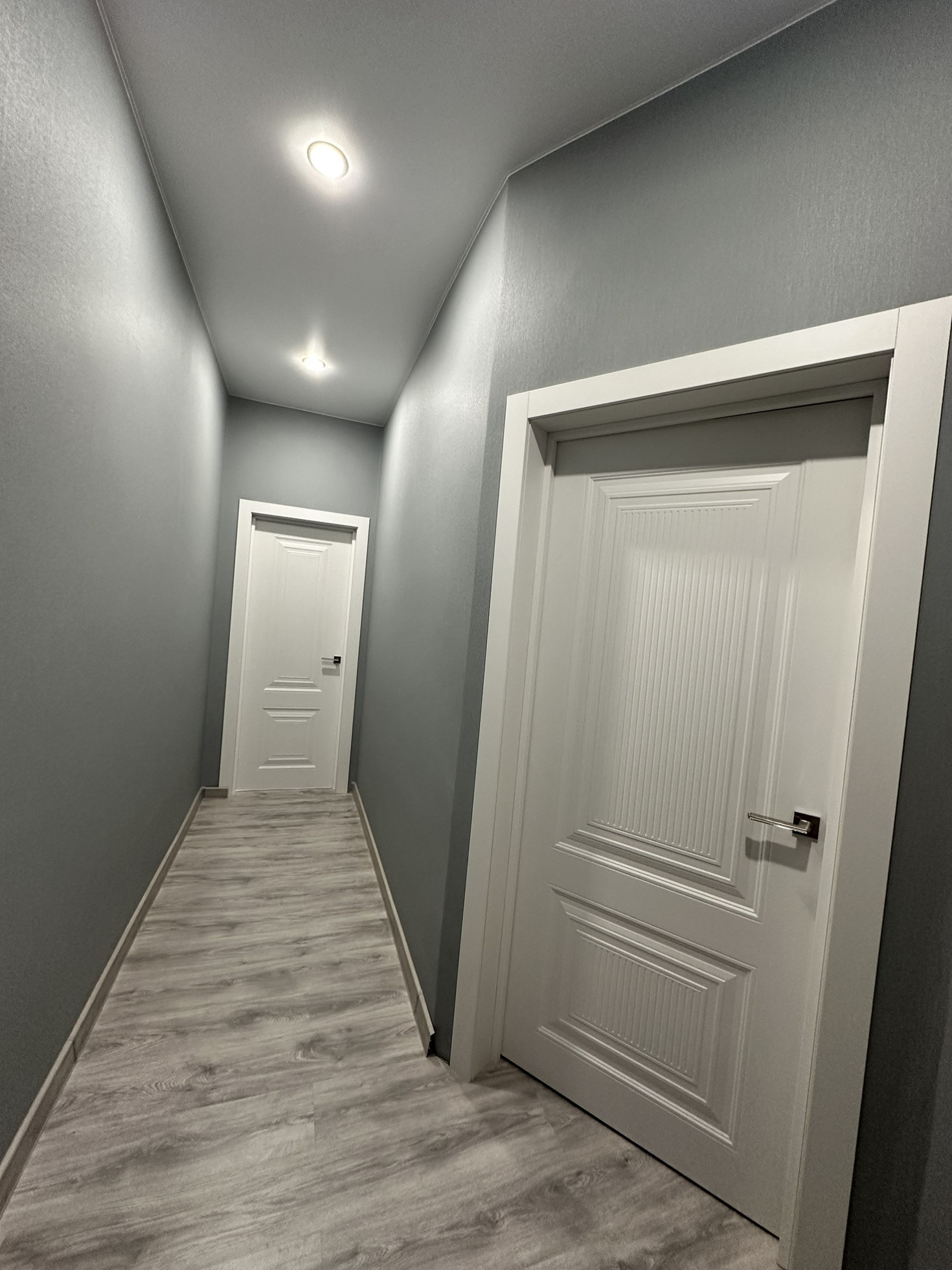 Поменяли пол, установили качественные двери, матовый натяжной потолок.